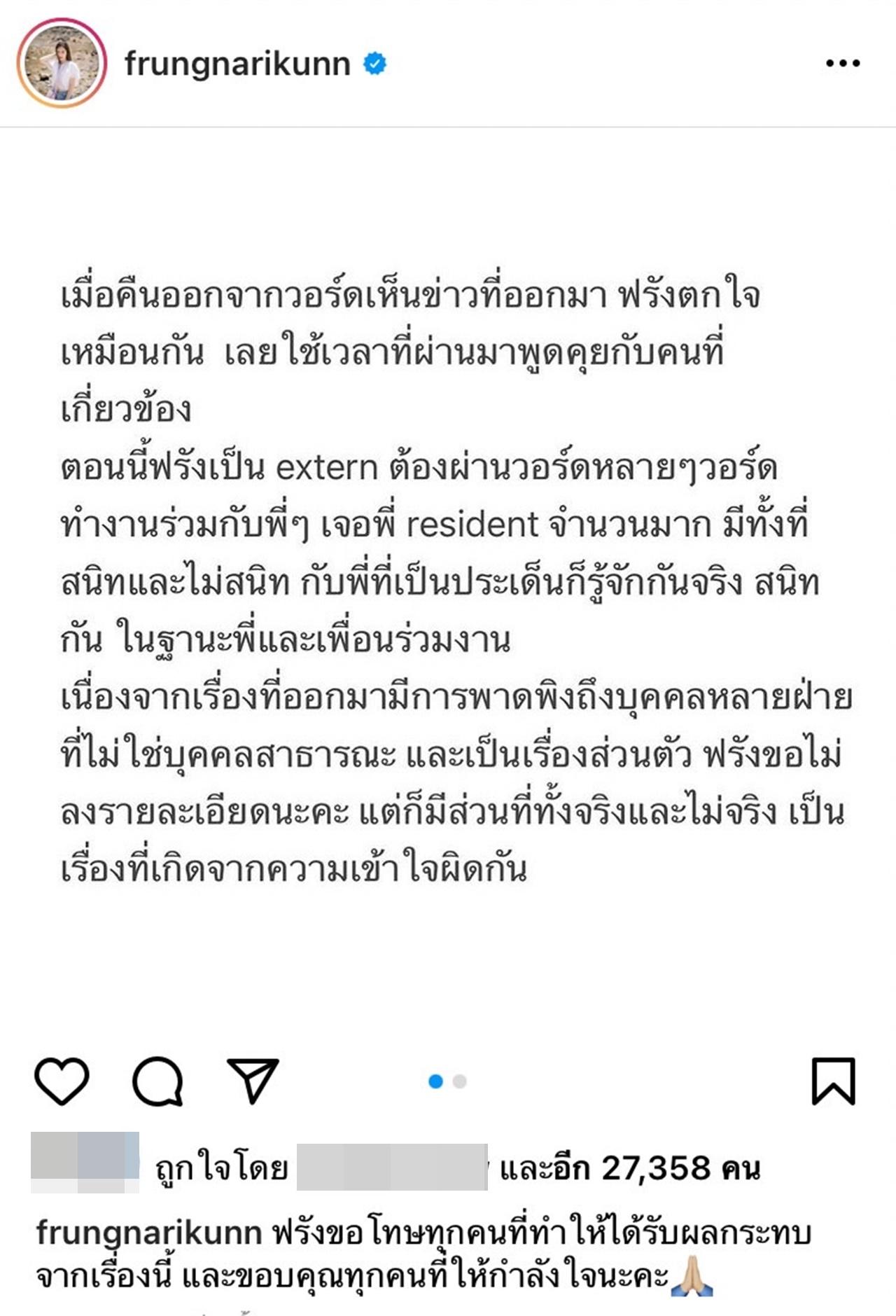 "เมื่อคืนออกจากวอร์ดเห็นข่าวที่ออกมา ฟรังตกใจเหมือนกัน เลยใช้เวลาที่ผ่านมาพูดคุยกับคนที่เกี่ยวข้อง ตอนนี้ฟรังเป็น extern ต้องผ่านวอร์ดหลายๆ วอร์ด ทำงานร่วมกับพี่ๆ เจอพี่ resident จำนวนมาก มีทั้งที่สนิทและไม่สนิท กับพี่ที่เป็นประเด็นก็รู้จักกันจริง สนิทกัน ในฐานะพี่และเพื่อนร่วมงาน