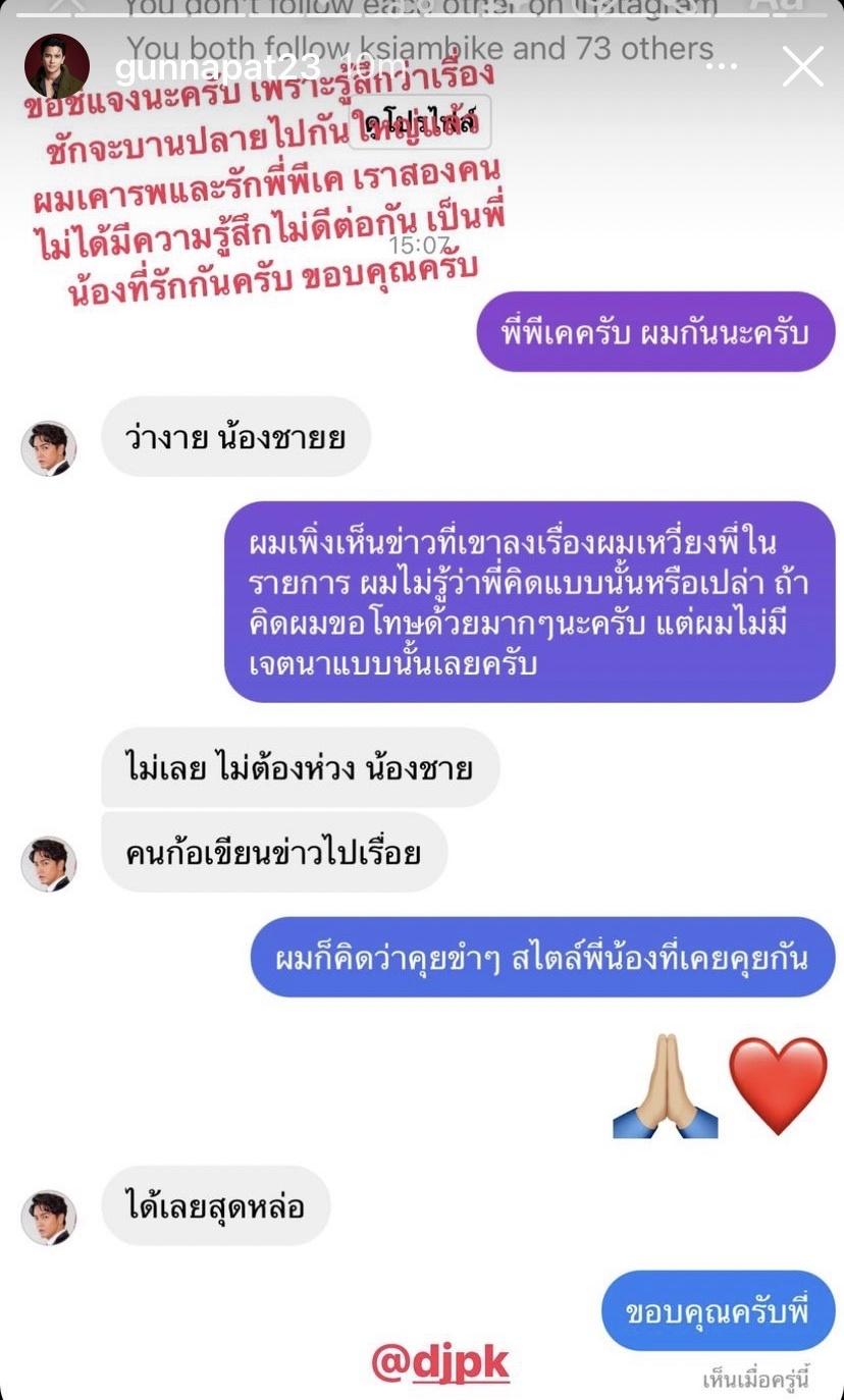 นอกจากนี้ กัน นภัทร ยังแคปข้อความการสนทนาออกมาลงไอจีสตอรี่ พร้อมแคปชั่นว่า "ขอชี้แจงนะครับ เพราะรู้สึกว่าเรื่องจะบานปลายไปกันใหญ่แล้ว ผมเคารพและรักพี่พีเค เราสองคนไม่ได้มีความรู้สึกไม่ดีต่อกัน เป็นพี่น้องที่รักกันครับ ขอบคุณครับ".