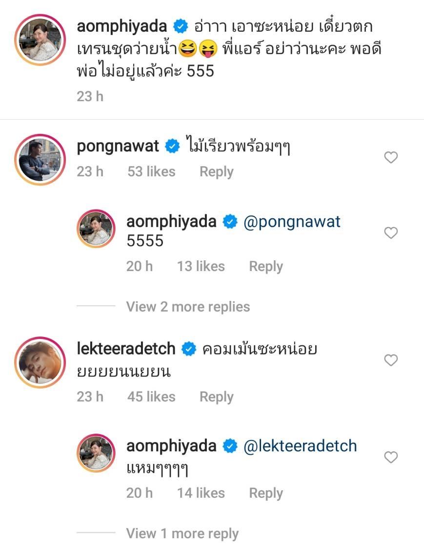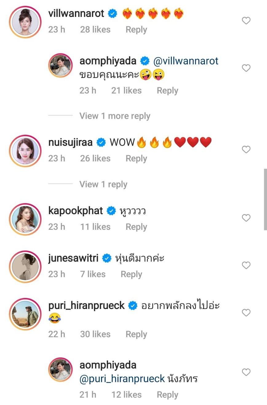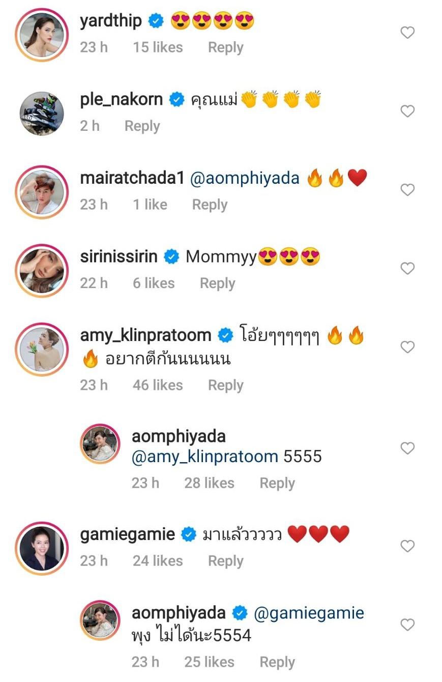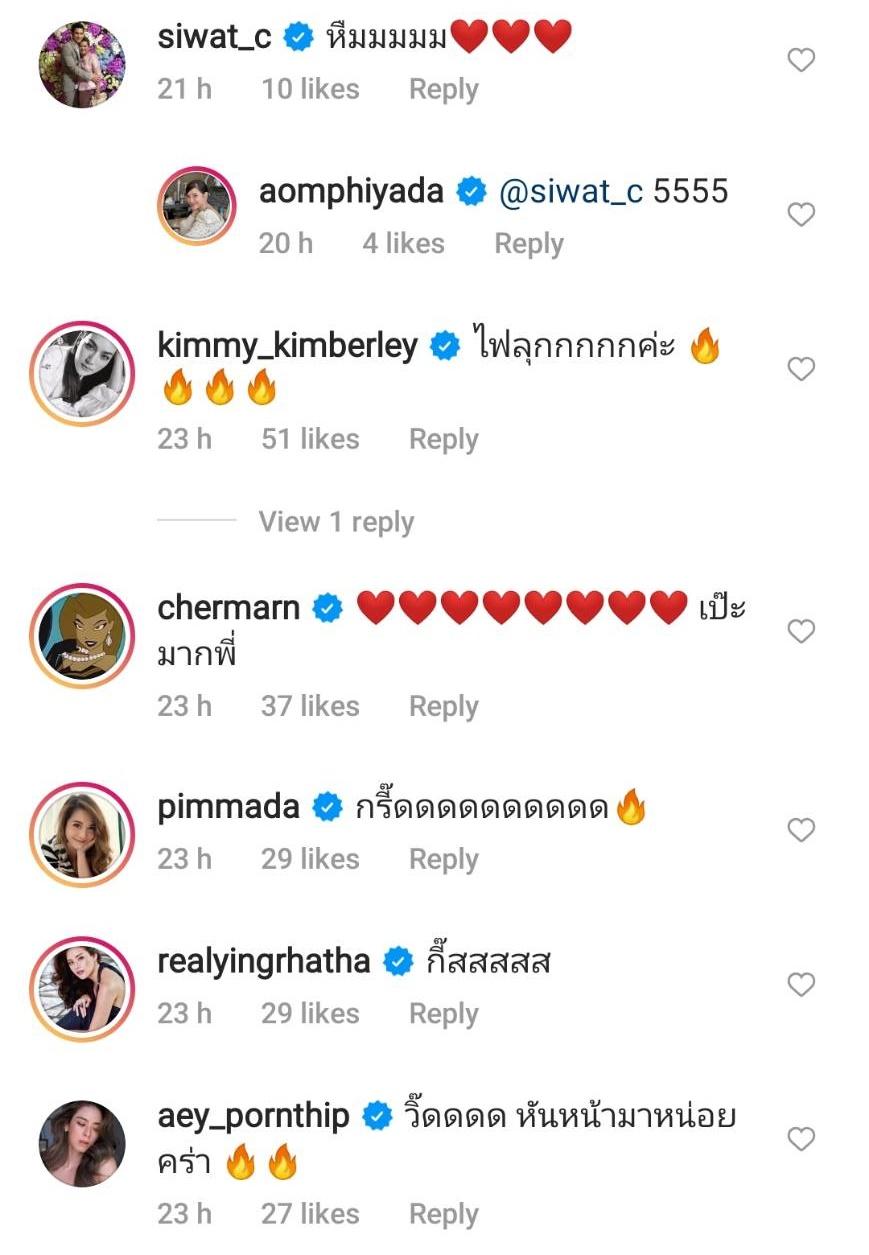 งานนี้เลยเจอบรรดาเพื่อนๆ ในวงการบันเทิงแห่แซวเต็มไอจี อาทิ ป้อง ณวัฒน์ “ไม้เรียวพร้อมๆๆ”, อาเล็ก ธีรเดช “คอมเม้นซะหน่อยยยยยนนยยน”, คิมเบอร์ลี่ แอน โวลเทมัส “ไฟลุกกกกกค่ะ”, พลอย เฌอมาลย์ “เป๊ะมากพี่”, พิมพ์ พิมพ์มาดา “กรี๊ดดดดดดดดดด”, หญิง รฐา “กี๊สสสสส”, เอ๋ พรทิพย์ “วิ๊ดดดด หันหน้ามาหน่อยคร่า”, ซี ศิวัฒน์ “หืมมมมม”, เอมี่ กลิ่นประทุม “โอ้ยๆๆๆๆๆๆ อยากตีก้นนนนนน” ฯลฯ