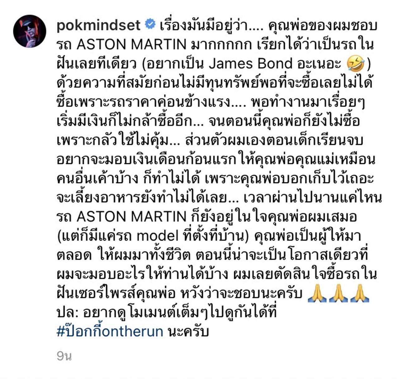 เวลาผ่านไปนานแค่ไหนรถ ASTON MARTIN ก็ยังอยู่ในใจคุณพ่อผมเสมอ (แต่ก็มีแค่รถ model ที่ตั้งที่บ้าน) คุณพ่อเป็นผู้ให้มาตลอด ให้ผมมาทั้งชีวิต ตอนนี้น่าจะเป็นโอกาสเดียวที่ผมจะมอบอะไรให้ท่านได้บ้าง ผมเลยตัดสินใจซื้อรถในฝันเซอร์ไพรส์คุณพ่อ หวังว่าจะชอบนะครับ ปล: อยากดูโมเมนต์เต็มๆไปดูกันได้ที่ #ป๊อกกี้ontherun นะครับ".