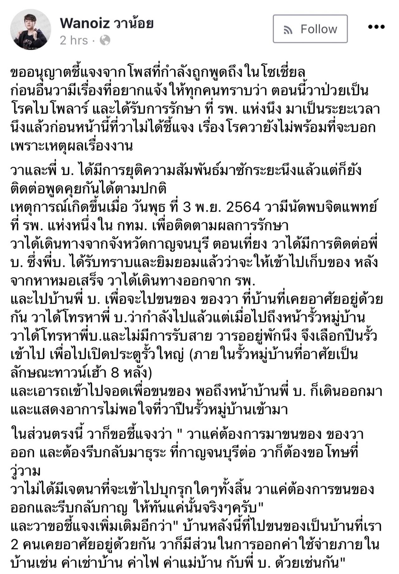 ก่อนจะพูดถึงเรื่องที่ถูกอีกฝ่ายคุกคาม บุกรุกบ้าน พูดจาข่มขู่ และถูกทำร้ายร่างกาย จนส่งผลต่อสภาพจิตใจของเธอไม่น้อย ล่าสุด วาน้อย Wanoiz ออกมาโพสต์ชี้แจงถึงประเด็นนี้ผ่านทางเฟซบุ๊กของตัวเองว่า