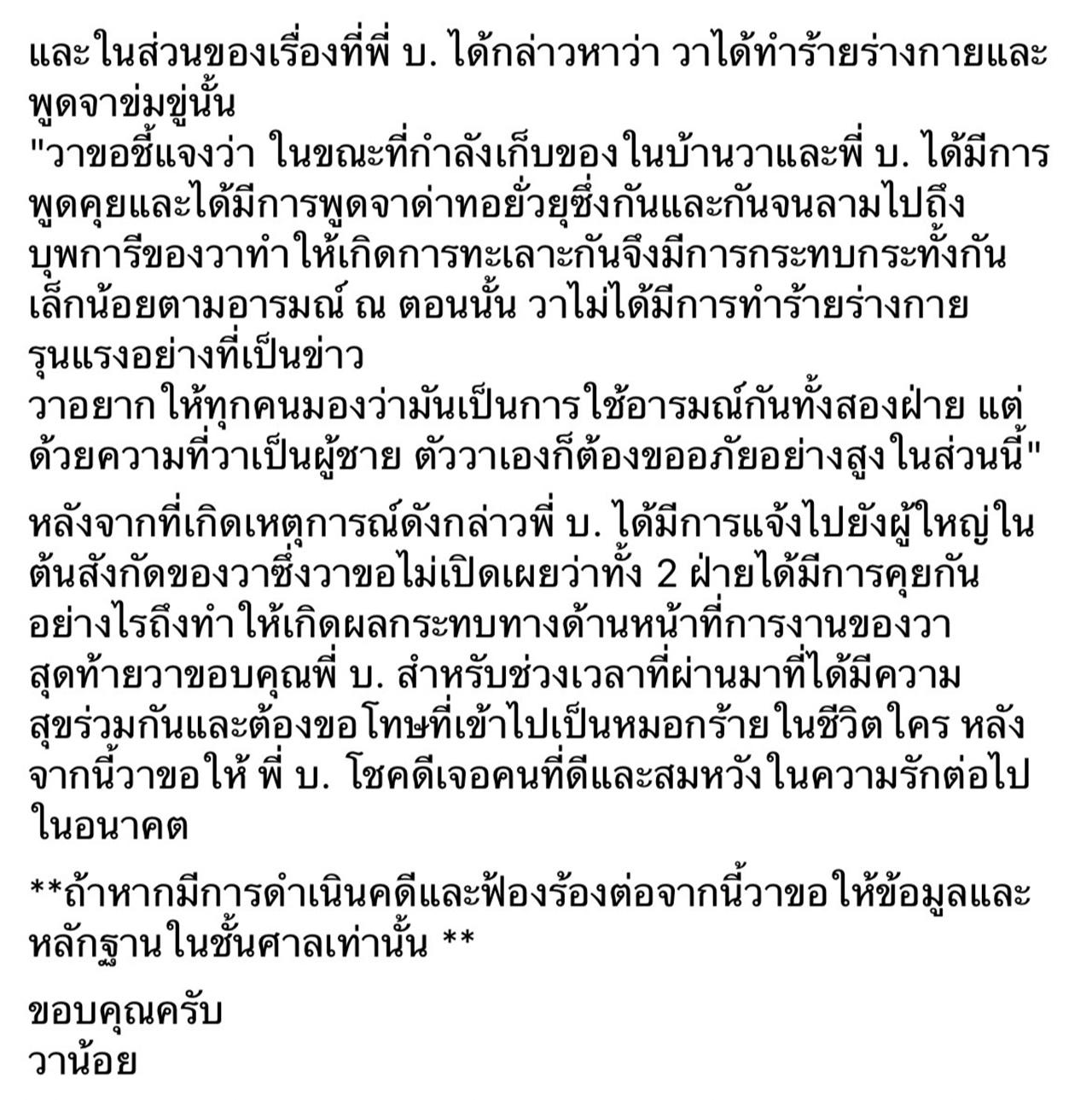 หลังจากนี้วาขอให้ พี่ บ. โชคดีเจอคนที่ดีและสมหวังในความรักต่อไปในอนาคต **ถ้าหากมีการดำเนินคดีและฟ้องร้องต่อจากนี้ วาขอให้ข้อมูลและหลักฐานในชั้นศาลเท่านั้น ** ขอบคุณครับ วาน้อย"