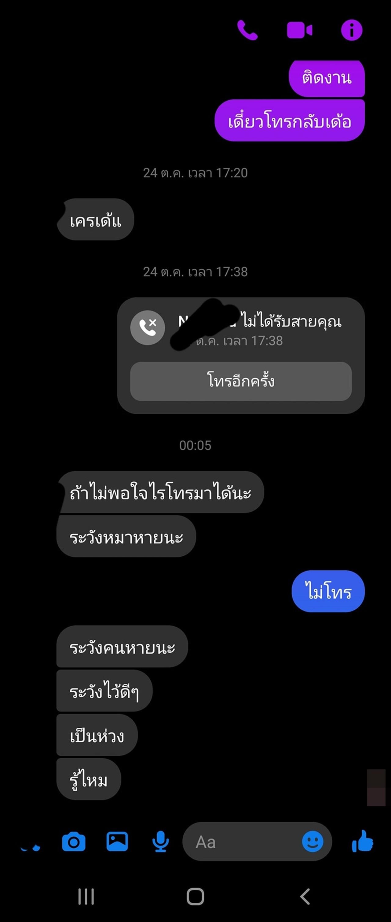 ทั้งข่มขู่ พูดไม่รู้เรื่อง และเริ่มหยาบคาย เราจึงบอกว่า นี่เกินไปแล้วนะ แล้วตัดสายไป หลังจากนั้นจึงได้รับข้อความตามภาพ สติดี คิดดีแล้วใช่ไหม ไบโพลาร์ปลอม เดี๋ยวเจอไบโพลาร์จริงนะ”