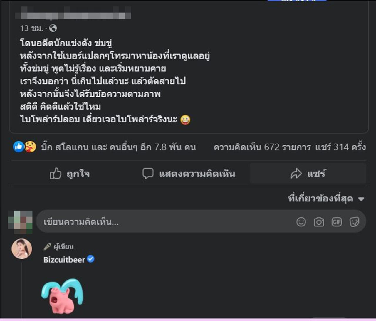ซึ่งผู้ใช้เฟซบุ๊กคนดังกล่าวได้เล่าถึงเหตุการณ์ที่เกิดขึ้นว่า “โดนอดีตนักแข่งดัง ข่มขู่ หลังจากใช้เบอร์แปลกๆโทรมาหาน้องที่เราดูแลอยู่