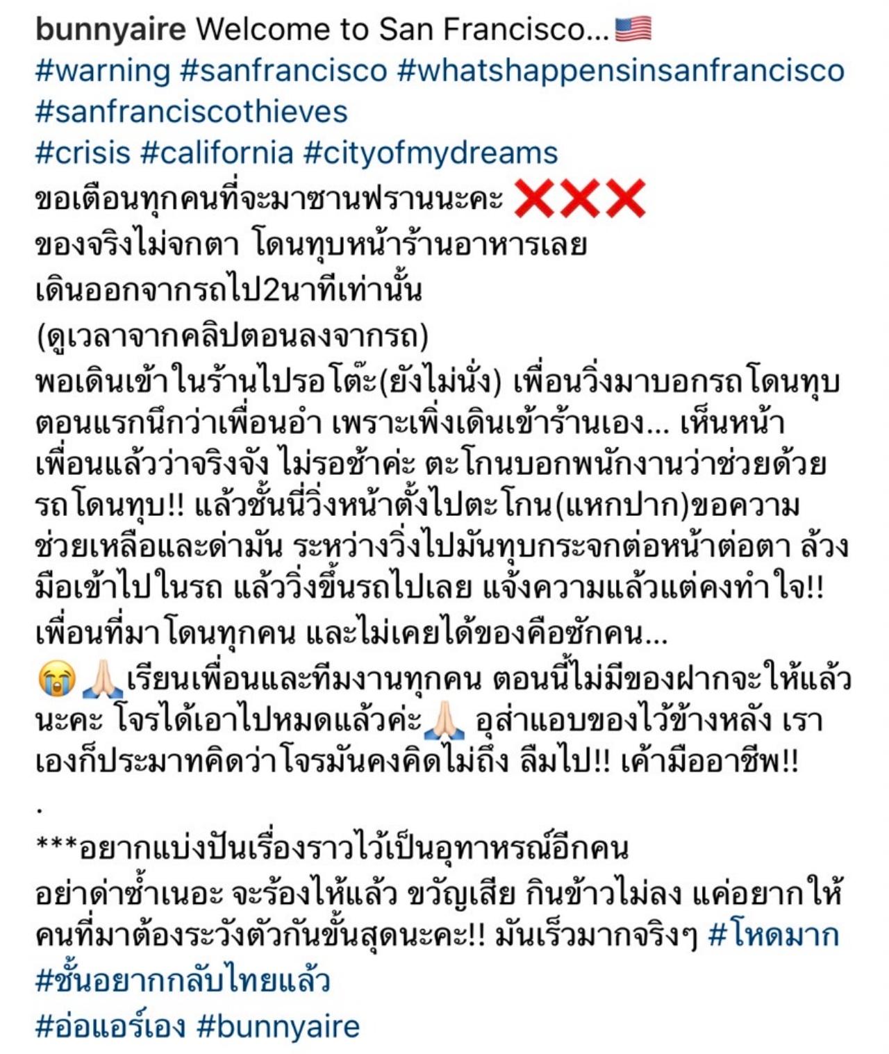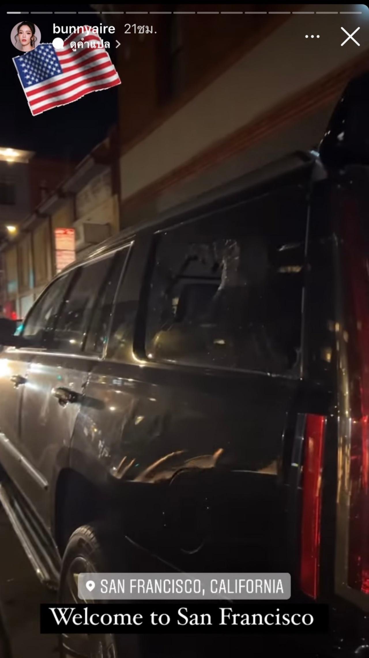 ซึ่งสาวแอร์ได้โพสต์ไอจีสตอรี่เป็นคลิปวิดีโอรถโดนคนร้ายทุบกระจกรถที่ ซานฟรานซิสโก และโพสต์ข้อความว่า “Welcome to San Francisco” พร้อมกับเล่าเหตุการณ์ที่เกิดขึ้นผ่านอินสตาแกรมของตัวเองว่า