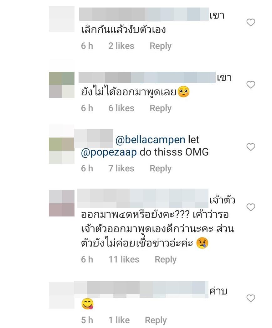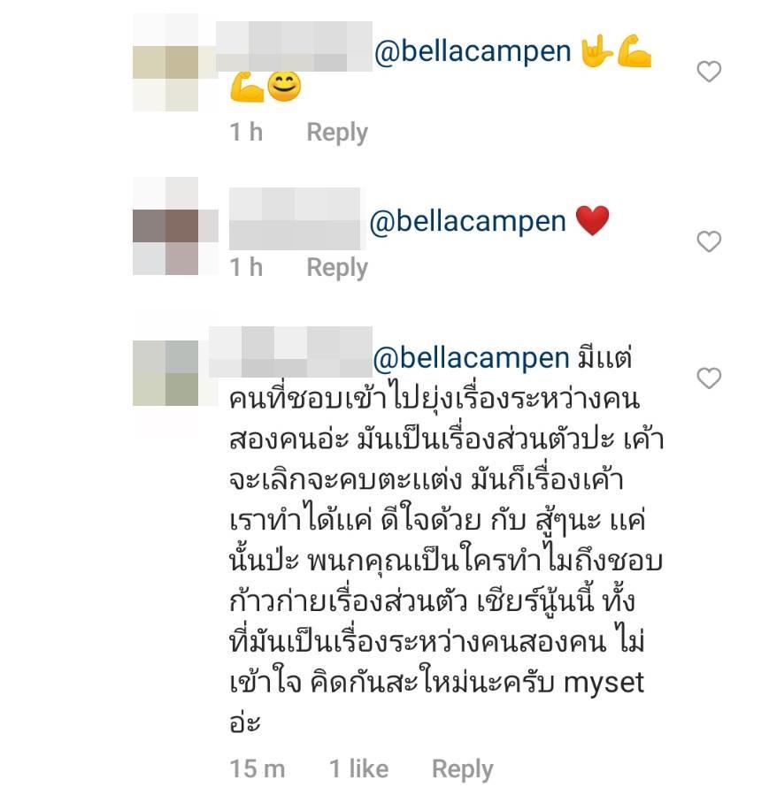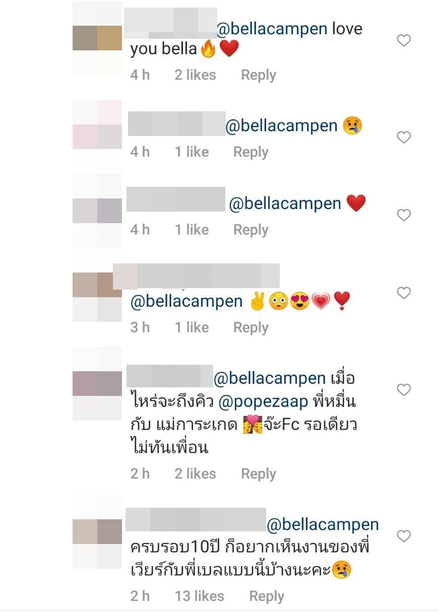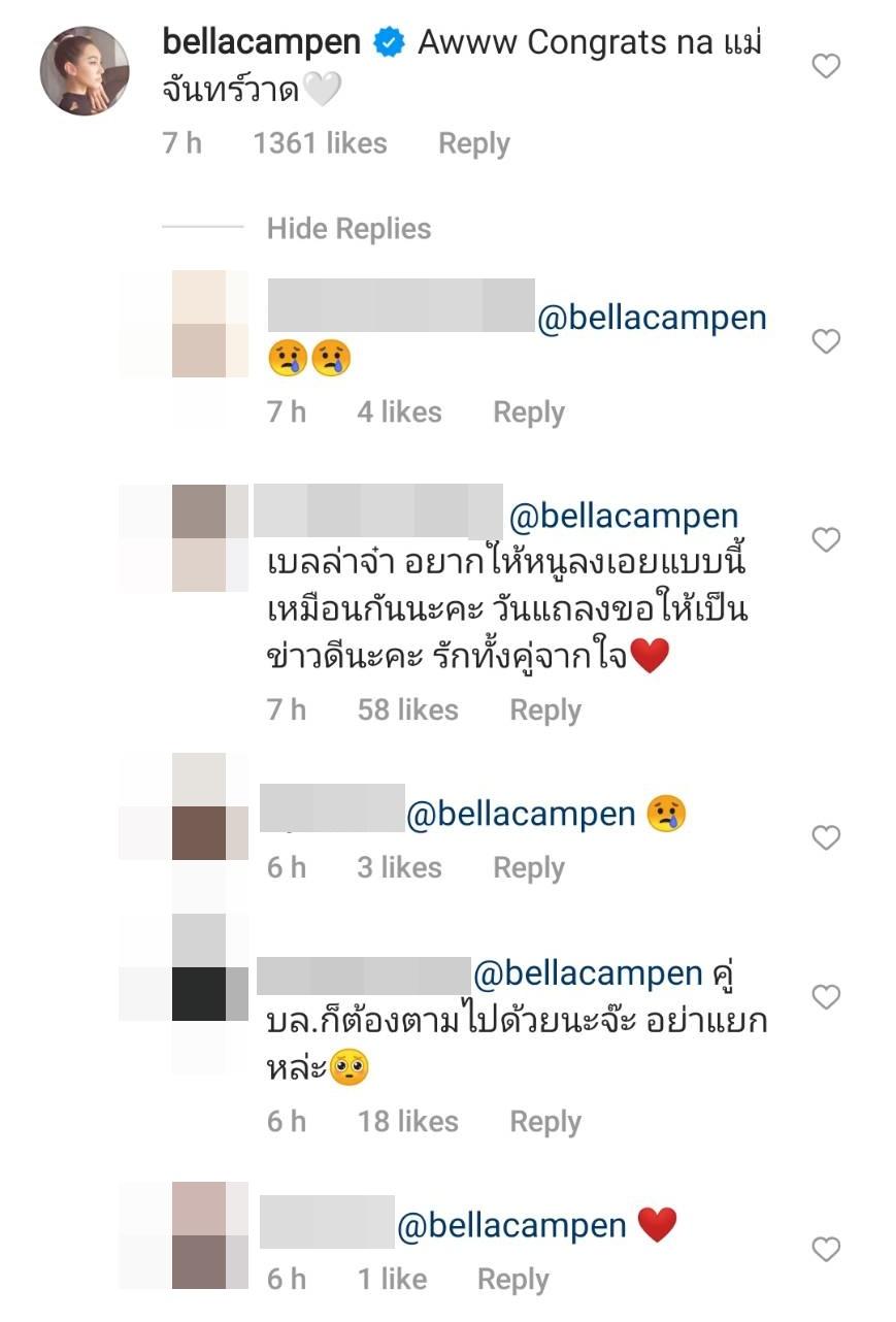 โดยคอมเมนต์ของเบลล่าในไอจีของปรางมีแฟนๆ แห่กดไลค์นับพัน พร้อมทั้งแสดงความคิดเห็น อาทิ เบลล่าจ๋า อยากให้หนูลงเอยแบบนี้เหมือนกันนะคะ วันแถลงขอให้เป็นข่าวดีนะคะ รักทั้งคู่จากใจ, คู่บล.ก็ต้องตามไปด้วยนะจ๊ะ อย่าแยกหล่ะ, อยากเห็นพี่เบลกับพี่เวียร์แบบนี้บ้างง ฯลฯ แต่แล้วก็มีคอมเมนต์จากชาวเน็ตรายหนึ่งว่า “เขาเลิกกันแล้วงับตัวเอง” ก่อนที่จะมีชาวเน็ตคนอื่นบอกว่าเขายังไม่ได้ออกมาพูดเลย กลายเป็นดราม่าเถียงกันเบาๆ ในไอจี.
