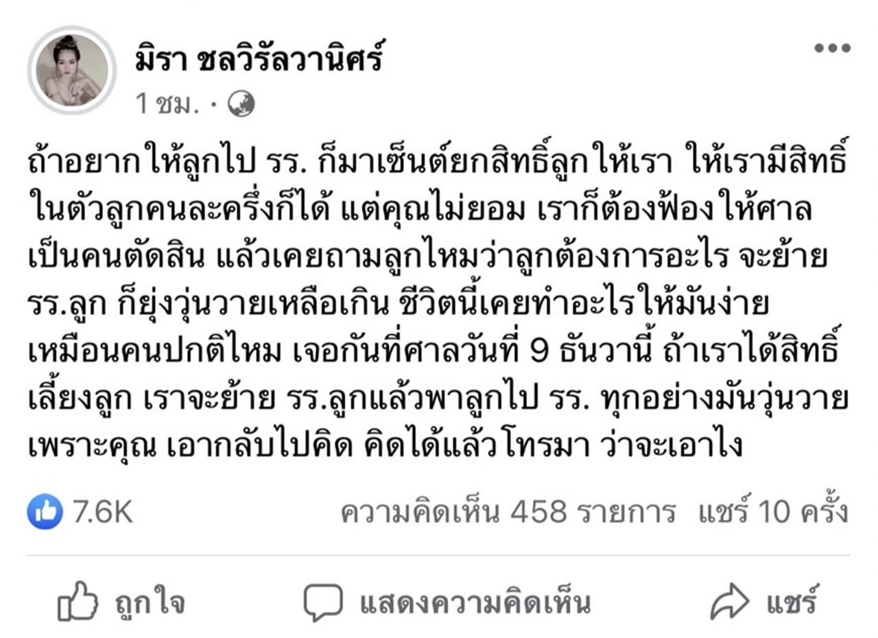 งานนี้ทำเอา เอ๋ มิรา ต้องออกมาโพสต์ข้อความผ่านทางเฟซบุ๊กส่วนตัว ด้วยการตอกกลับแบบเดือดๆ ว่า “ถ้าอยากให้ลูกไป รร. ก็มาเซ็นต์ยกสิทธิ์ลูกให้เรา ให้เรามีสิทธิ์ในตัวลูกคนละครึ่งก็ได้