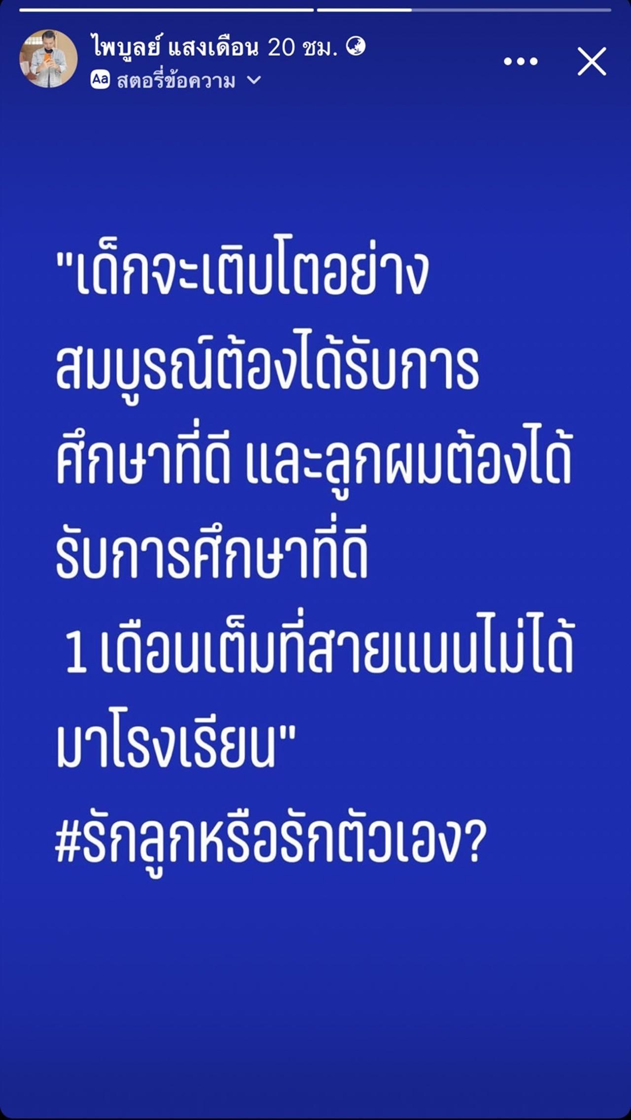 และล่าสุด ครูไพบูลย์ ได้โพสต์เดือดผ่านทางเฟซบุ๊กสตอรี่ของตัวเอง ซึ่งมีข้อความว่า “เด็กจะเติบโตอย่างสมบูรณ์ต้องได้รับการศึกษาที่ดี และลูกผมต้องได้รับการศึกษาที่ดี 1 เดือนเต็มที่สายแนนไม่ได้มาโรงเรียน รักลูกหรือรักตัวเอง?”