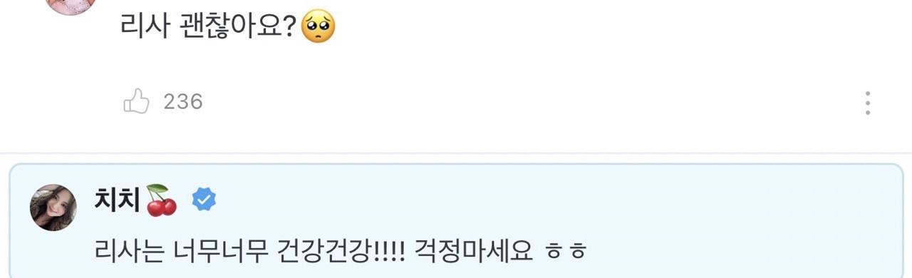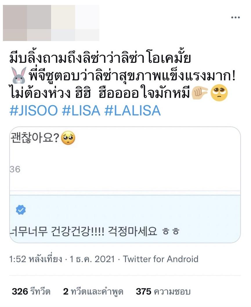 ซึ่งมีข้อความดังนี้ "มีบลิ๊งถามถึงลิซ่าว่าลิซ่าโอเคมั้ย พี่จีซูตอบว่าลิซ่าสุขภาพแข็งแรงมาก! ไม่ต้องห่วง ฮิฮิ ฮืออออใจมักหมี" พร้อมกับทวีตรูปข้อความที่จีซูเข้ามาคอมเมนต์ตอบแฟนๆ ที่ถามเพื่อเป็นหลักฐาน และหลังจากที่ชาวบลิ๊งค์ได้ทราบข่าวนี้ ก็พร้อมใจกันกดไลค์และรีทวีตดังกล่าวเป็นจำนวนมาก