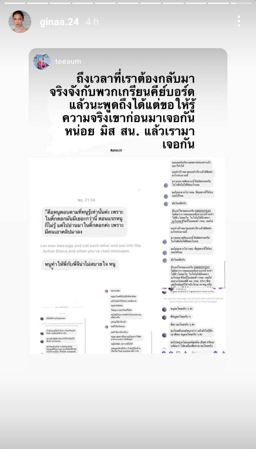 นอกจากนี้จีน่ายังได้แชร์ไอจีสตอรี่ของผู้จัดการส่วนตัว ซึ่งโพสต์ภาพแคปข้อความคนที่เคยแซะเธอไว้อีกเพียบ ซึ่งมีข้อความบรรยายว่า “ถึงเวลาที่เราต้องกลับมาจริงจังกับพวกเกรียนคีย์บอร์ดแล้วนะ พูดถึงได้แต่ขอให้รู้ความจริงเขาก่อน มาเจอกันหน่อย มิส สน. แล้วเรามาเจอกัน”.
