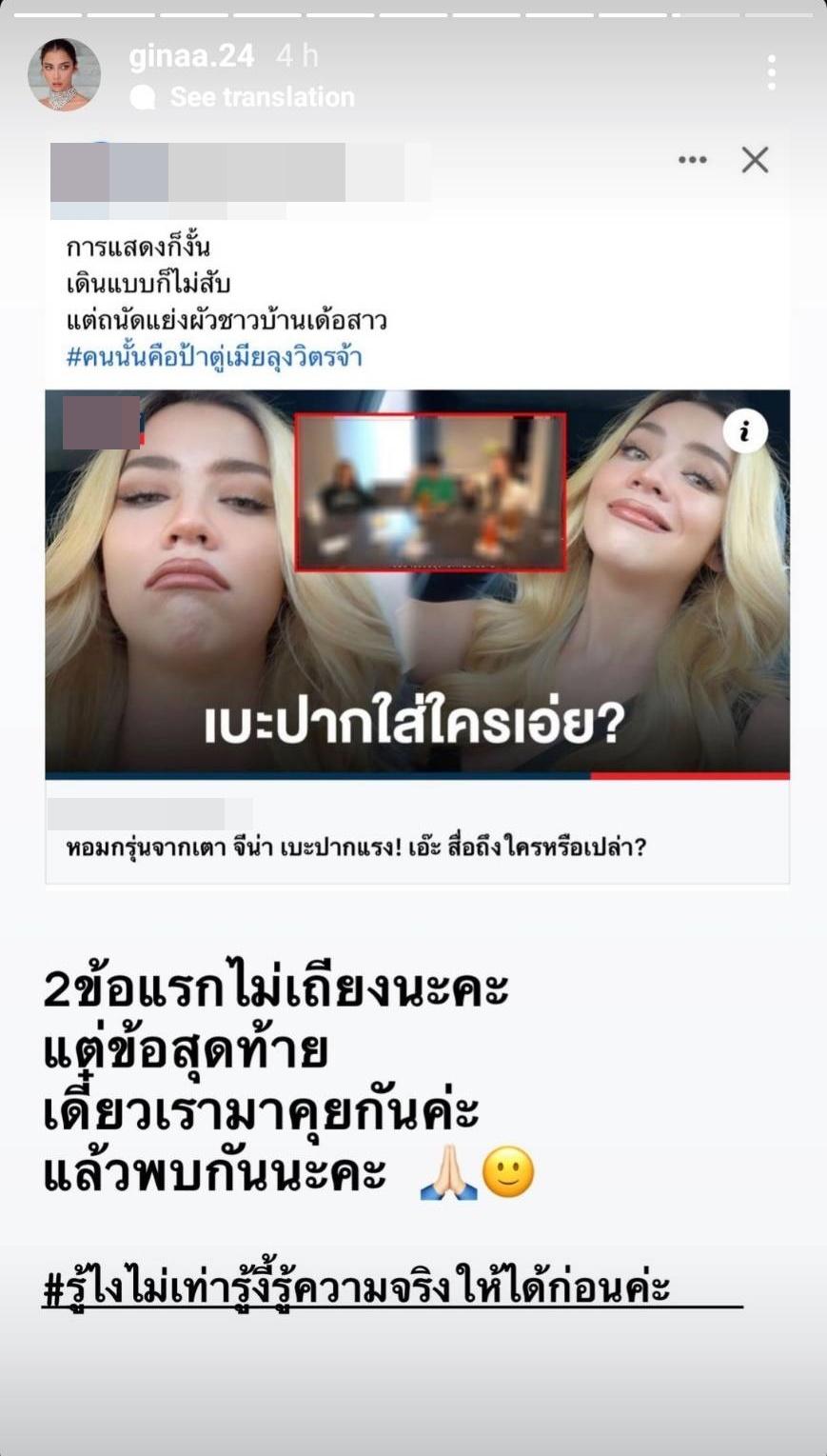 อีกทั้งยังโพสต์ภาพแคปของผู้ใช้เฟซบุ๊กรายหนึ่งที่แชร์ข่าวของจีน่าแล้วบอกว่า “การแสดงก็งั้น เดินแบบก็ไม่สับ แต่ถนัดแย่งผัวชาวบ้านเด้อสาว #คนนั้นคือป้าตู่เมียลุงวิตรจ้า” ซึ่งจีน่าก็เขียนแคปชั่นว่า “2 ข้อแรก ไม่เถียงนะคะ แต่ข้อสุดท้าย เดี๋ยวเรามาคุยกันค่ะ แล้วพบกันนะคะ #รู้ไงไม่เท่ารู้งี้รู้ความจริงให้ได้ก่อนค่ะ”