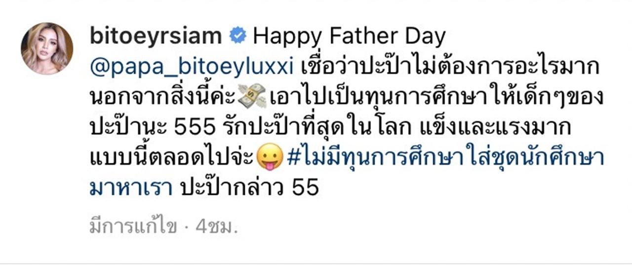 "Happy Father Day @papa_bitoeyluxxi เชื่อว่าปะป๊าไม่ต้องการอะไรมากนอกจากสิ่งนี้ค่ะ เอาไปเป็นทุนการศึกษาให้เด็กๆ ของปะป๊านะ 555 รักปะป๊าที่สุดในโลก แข็งและแรงมากแบบนี้ตลอดไปจ้ะ #ไม่มีทุนการศึกษาใส่ชุดนักศึกษามาหาเรา ปะป๊ากล่าว 55"
