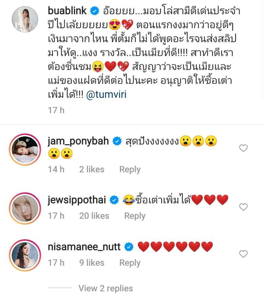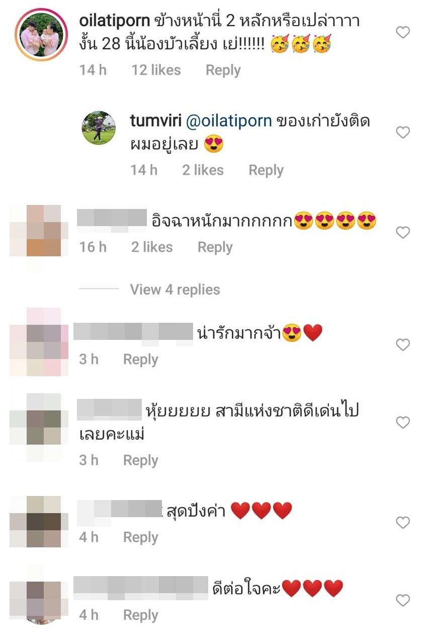 ด้าน ออย อฏิพรณ์ ภรรยาของบีม ซึ่งเป็นพี่สะใภ้ของบัว ก็เข้ามาแซวว่า “ข้างหน้านี่ 2 หลักหรือเปล่าาาา งั้น 28 นี้น้องบัวเลี้ยง เย่!!!!!!” ก่อนที่ตั้ม สามีของบัว จะคอมเมนต์ตอบกลับว่า “ของเก่ายังติดผมอยู่เลย”.
