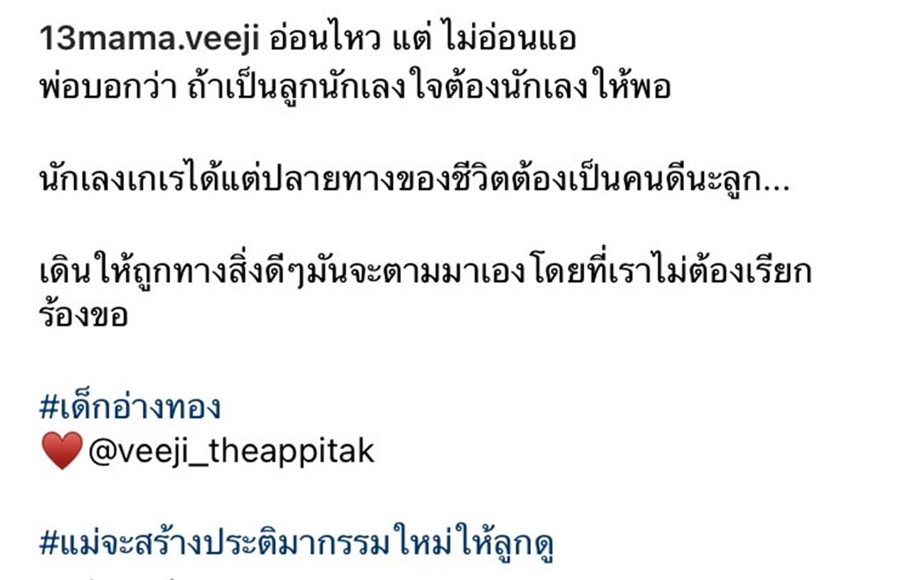 "อ่อนไหว แต่ ไม่อ่อนแอ พ่อบอกว่า ถ้าเป็นลูกนักเลงใจต้องนักเลงให้พอ นักเลงเกเรได้แต่ปลายทางของชีวิตต้องเป็นคนดีนะลูก... เดินให้ถูกทางสิ่งดีๆ มันจะตามมาเองโดยที่เราไม่ต้องเรียกร้องขอ #เด็กอ่างทอง @veeji_theappitak #แม่จะสร้างประติมากรรมใหม่ให้ลูกดู".
