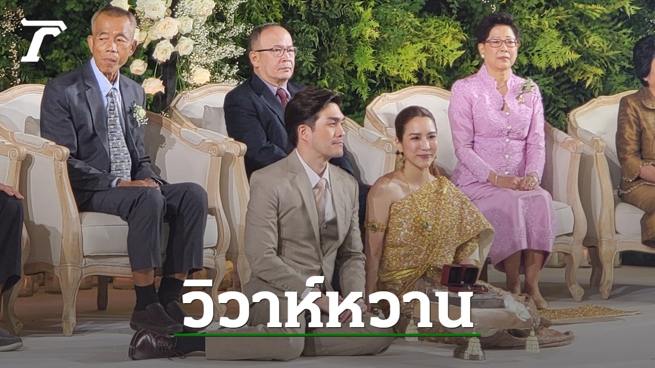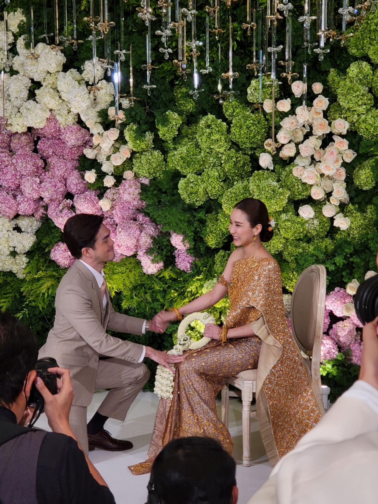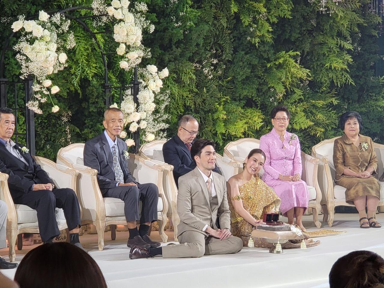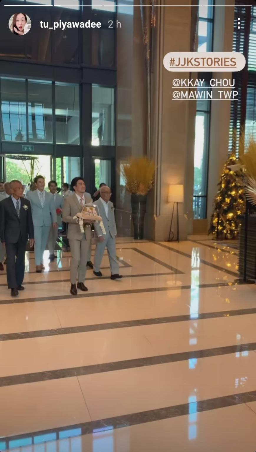 ส่วนของเจ้าบ่าวนั้น มาในลุคชุดสูทสากลสีน้ำตาลเข้มสุดเรียบโก้ เสริมลุคด้วยเนกไทที่ตัดเย็บจากผ้าไหมสีเดียวกันกับชุดของเจ้าสาว สำหรับมูลค่าของชุดเจ้าบ่าวและเจ้าสาวในวันนี้นั้นเฉียดหลักล้านเลยทีเดียว บันเทิงไทยรัฐออนไลน์ขอแสดงความยินดีกับทั้งคู่ด้วยนะคะ.