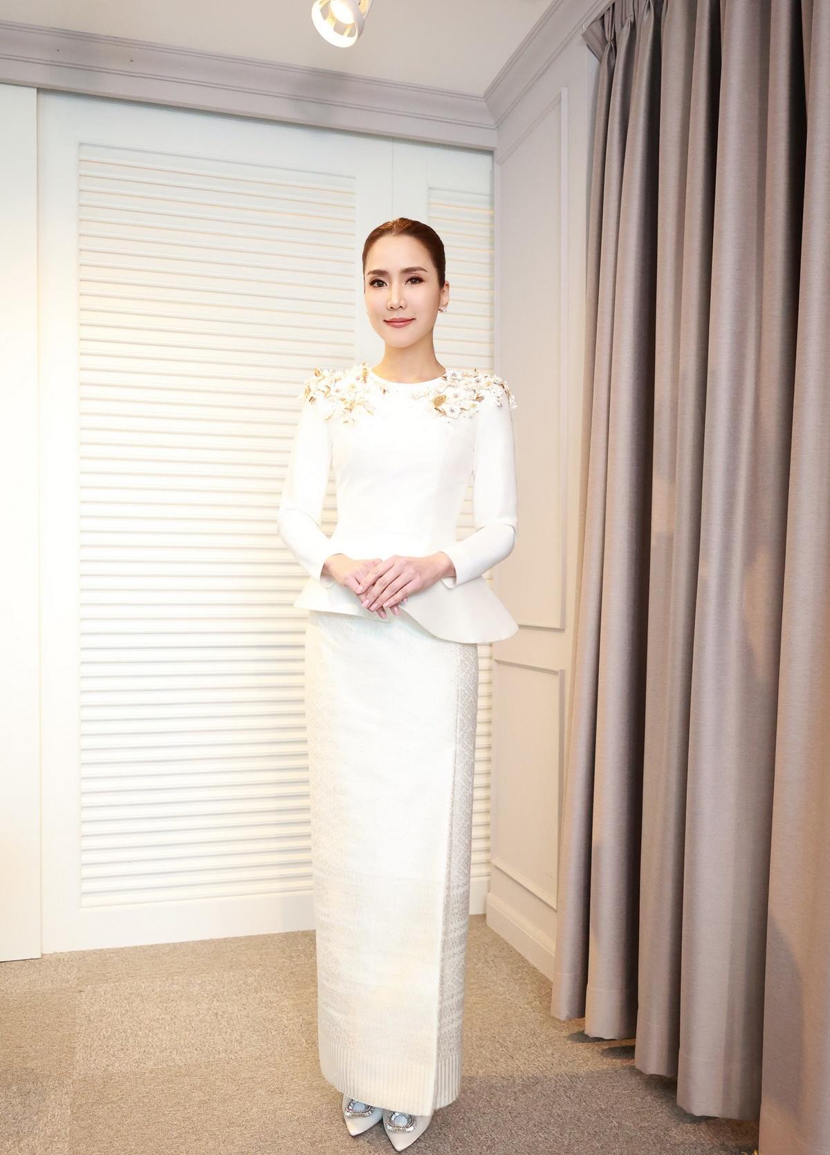 ส่วนเจ้าบ่าวก็มาในลุคที่ดูหรูหราไม่แพ้กัน ด้วยการเลือกสวมชุดสูทสากลสีครีมสุดสมาร์ทที่ตัดเย็บจากผ้าวูลเกรดพรีเมียม เพิ่มดีเทลด้วยเนกไทที่ตัดเย็บจากผ้าไหมลำพูนสีขาวผืนเดียวกันกับชุดของเจ้าสาว เพื่อเสริมความเป็นอันหนึ่งอันเดียวกันของชีวิตของทั้งคู่