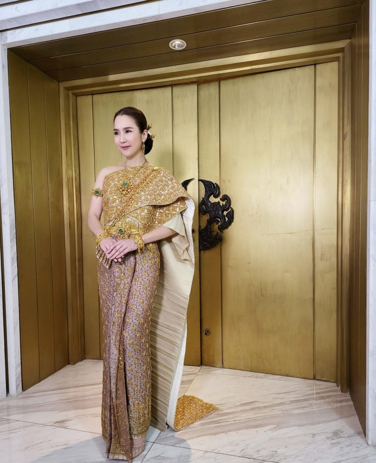 ส่วนชุดพิธีรดน้ำสังข์ เจ้าสาวมาในลุคชุดไทยจักรพรรดิแบบโบราณสีนาค ตัวสไบมีความพิเศษคือการนำโอบิผ้าไหมที่ทอออกมาเป็นลวดลายของดอกเบญจมาศ (Kiku) เป็นสัญลักษณ์แห่งราชวงศ์ญี่ปุ่น มีความหมายเพื่อให้มีสุขภาพแข็งแรง อายุยืนยาว รวมถึงขจัดสิ่งไม่ดีออกไป นำมาปักด้วยดิ้นทองคำลักษณะคล้ายกับงานโขนของไทยแบบโบราณ ตัวผ้าไหมอัดกลีบทำมาจากผ้าไหมพื้นจากอำเภอปักธงชัย ผ้านุ่งใช้เป็นลักษณะนุ่งสดเน้นทรวดทรงของเจ้าสาว ปักด้วยคริสตัลทองคำทั้งผืนและประดับตกแต่งด้วยเครื่องประดับทองคำแบบโบราณที่ทำขึ้นโดยครูช่างทองระดับบรมครู