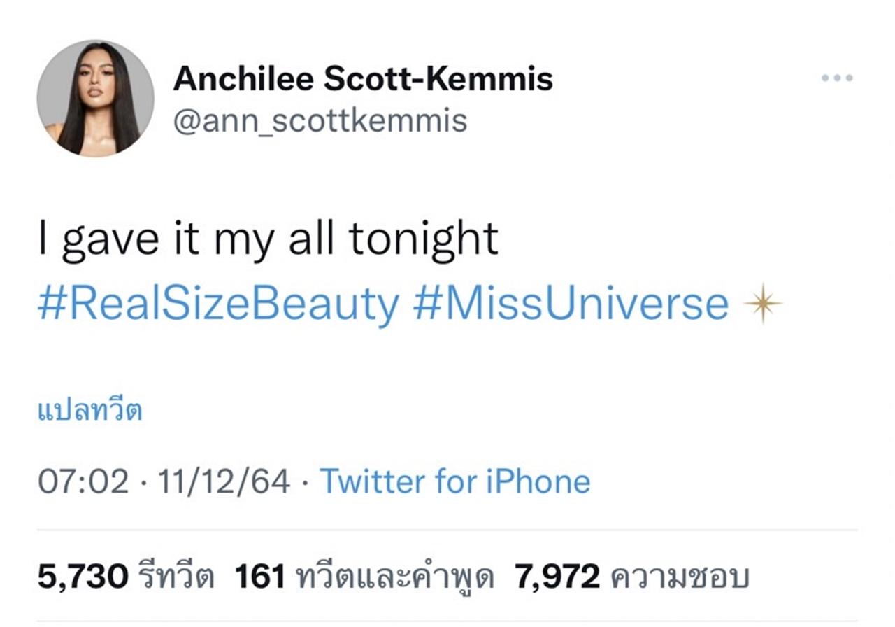 ล่าสุด แอนชิลี ก็ได้ทวีตข้อความผ่านทางทวิตเตอร์ของเธอ โดยมีข้อความว่า "I gave it my all tonight #RealSizeBeauty #MissUniverse"