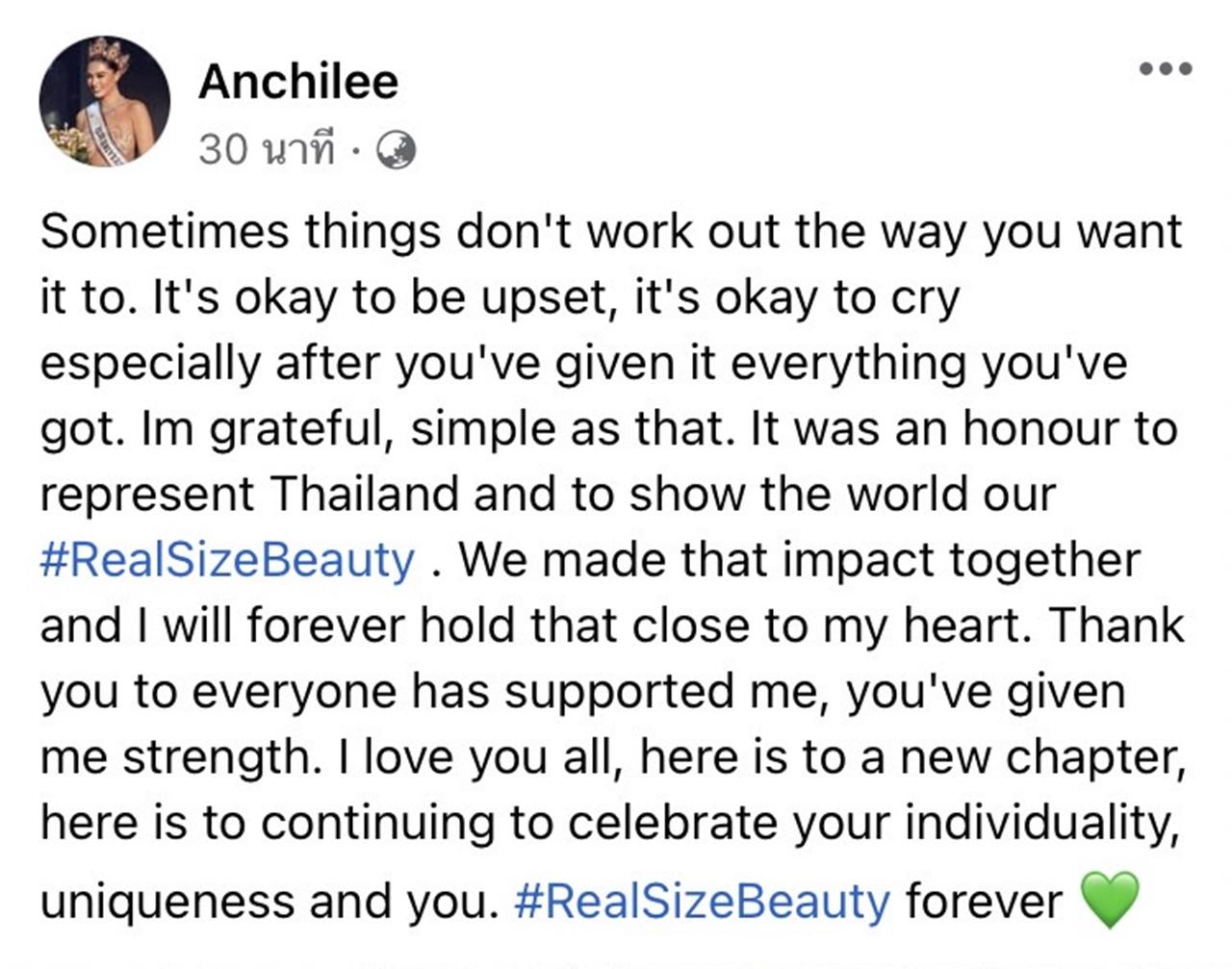 "Sometimes things don't work out the way you want it to. It's okay to be upset, it's okay to cry especially after you've given it everything you've got. Im grateful, simple as that. It was an honour to represent Thailand and to show the world our #RealSizeBeauty .