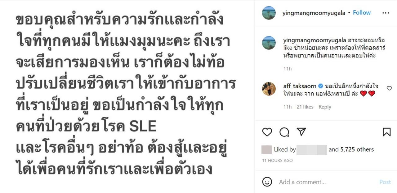 "ขอบคุณสำหรับความรักและกำลังใจที่ทุกคนมีให้แมงมุมนะคะ ถึงเราจะเสียการมองเห็น เราก็ต้องไม่ท้อปรับเปลี่ยนชีวิตเรา ให้เข้ากับอาการที่เราเป็นอยู่ ขอเป็นกำลังใจให้ทุกคนที่ป่วยด้วยโรค SLE และโรคอื่นๆ อย่าท้อ ต้องสู้และอยู่ได้เพื่อคนที่รักเราและเพื่อตัวเอง"