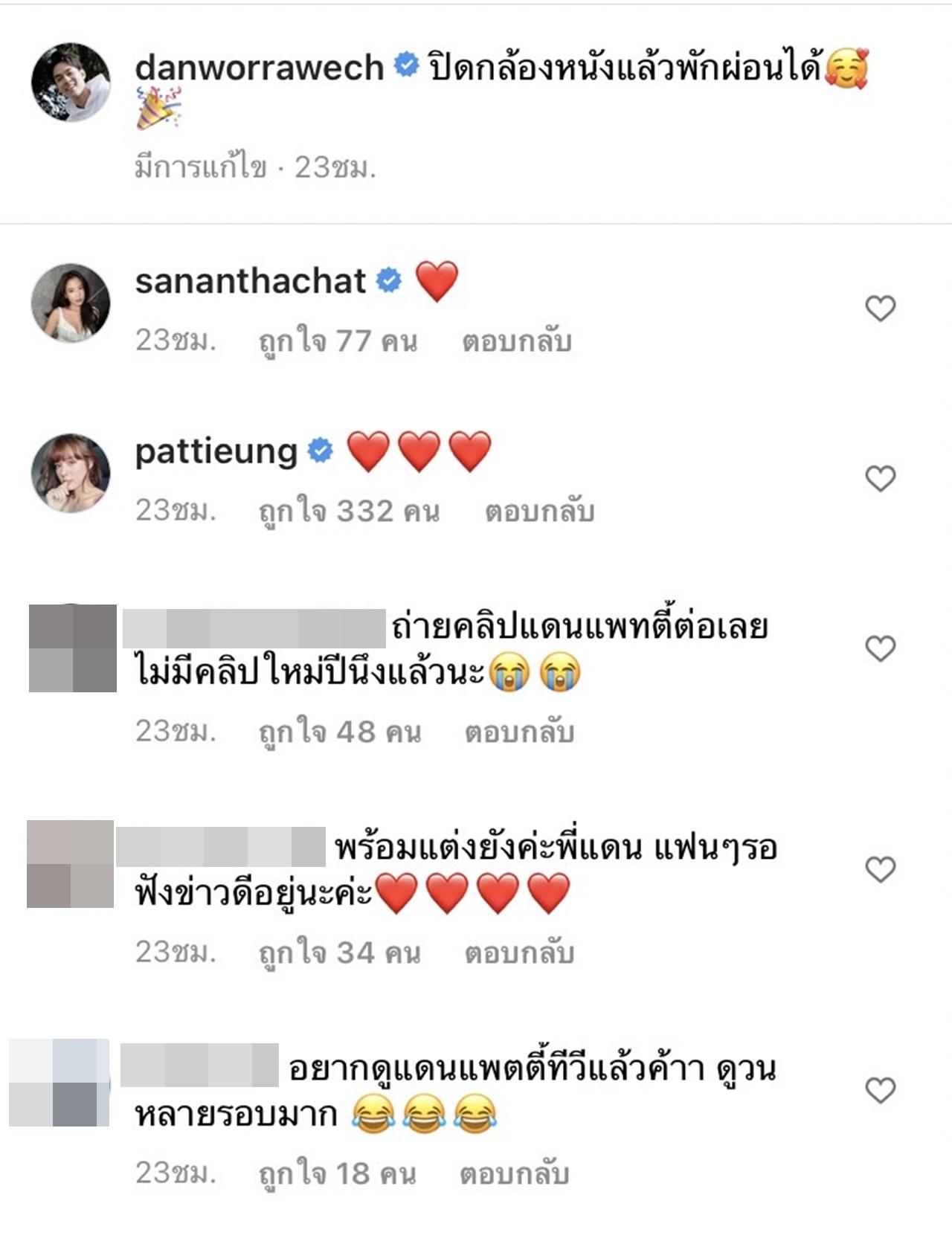 ด้าน แพตตี้ ก็ได้โพสต์ภาพสุดหวานกับหนุ่ม แดน เช่นกัน งานนี้แฟนๆ ที่ติดตามต่างเข้ามาคอมเมนต์กันเป็นจำนวนมาก พร้อมกับเชียร์อยากให้คู่นี้มีข่าวดีเร็วๆ อีกทั้งเข้ามาถามกันอย่างมากมายว่า เมื่อไหร่จะได้เห็นแดนกับแพตตี้ทำยูทูบด้วยกันอีก.
