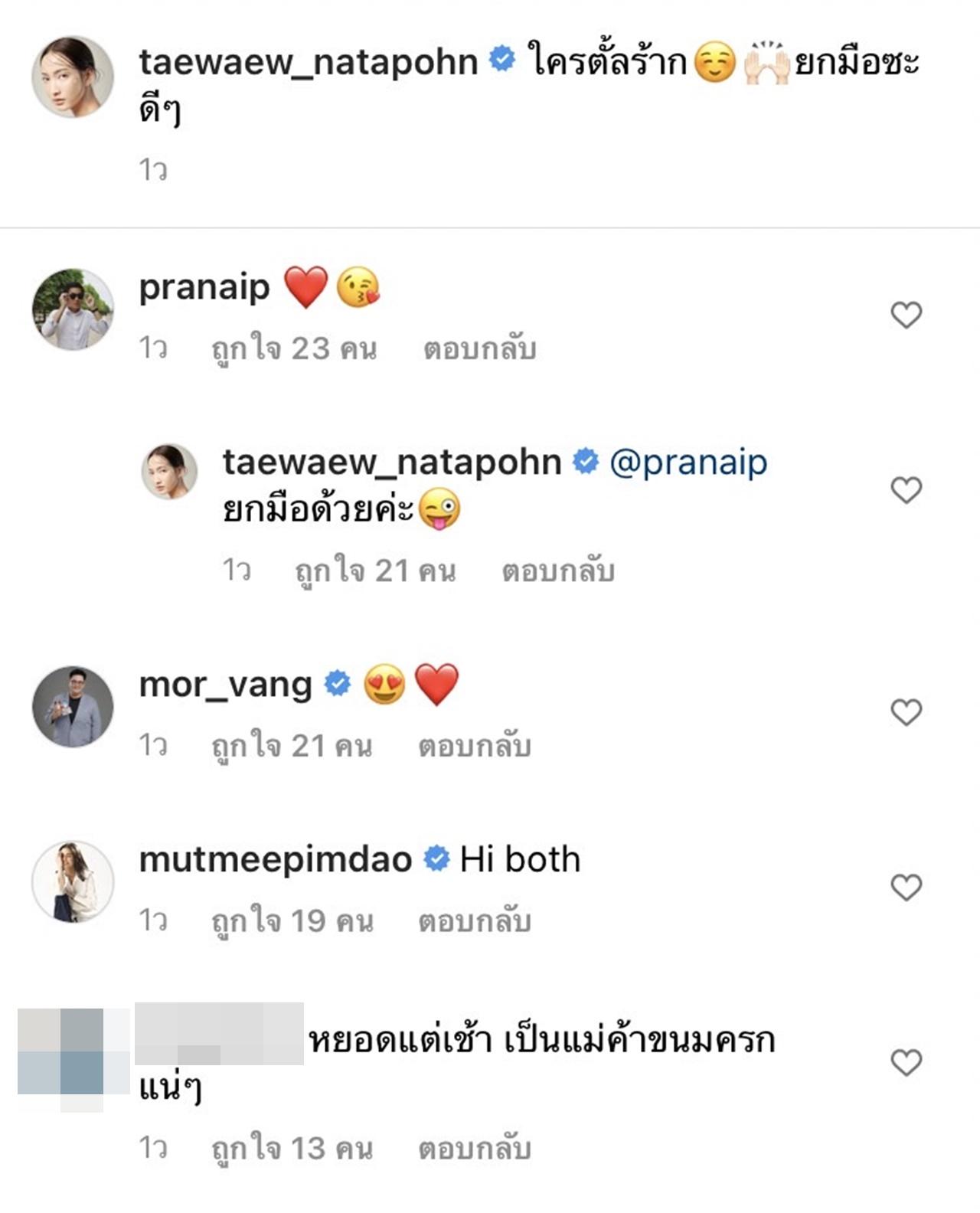 และด้วยความรักที่กำลังเบ่งบานสุดๆ แต้ว ก็มีภาพสุดหวานคู่กับแฟนหนุ่มออกมาให้เห็นเรื่อยๆ อย่างในภาพล่าสุดเจ้าตัวก็ได้โพสต์ภาพในชอตน่ารักๆ คู่กับ ไฮโซณัย และใส่เสื้อสีขาวเหมือนกัน พร้อมกับเขียนแคปชั่นว่า "ใครตั้ลร้าก ยกมือซะดีๆ" ด้าน ณัย ก็ได้เข้ามาคอมเมนต์เป็นรูปหัวใจ และแต้วก็ได้ตอบกลับว่า "ยกมือด้วยค่ะ".