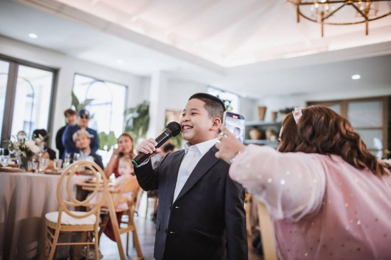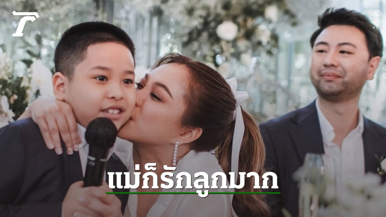 ซึ่งภายในงานได้มีการให้เพื่อนๆ พูดคำอวยพรคู่บ่าวสาว และ 1 ในนั้นคือ น้องดีน ลูกชายวัย 7 ขวบ ที่ยกมือขึ้นขอออกมาพูดอวยพรคุณแม่ด้วยตัวเอง งานนี้ทำเอาคนเป็นแม่เซอร์ไพรส์มาก