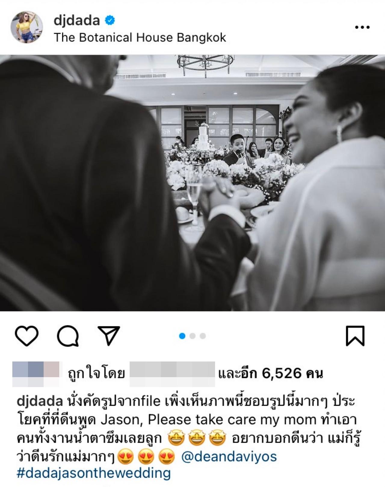 ล่าสุด ดาด้า ก็ได้โพสต์ภาพของ น้องดีน ที่กำลังยืนจับไมค์พูดอวยพรคุณแม่กับเจสัน พร้อมกับเขียนข้อความใต้ภาพว่า "นั่งคัดรูปจากfile เพิ่งเห็นภาพนี้ชอบรูปนี้มากๆ ประโยคที่ที่ดีนพูด Jason, Please take care my mom ทำเอาคนทั้งงานน้ำตาซึมเลยลูก อยากบอกดีนว่า แม่ก็รู้ว่าดีนรักแม่มากๆ @deandaviyos #dadajasonthewedding"