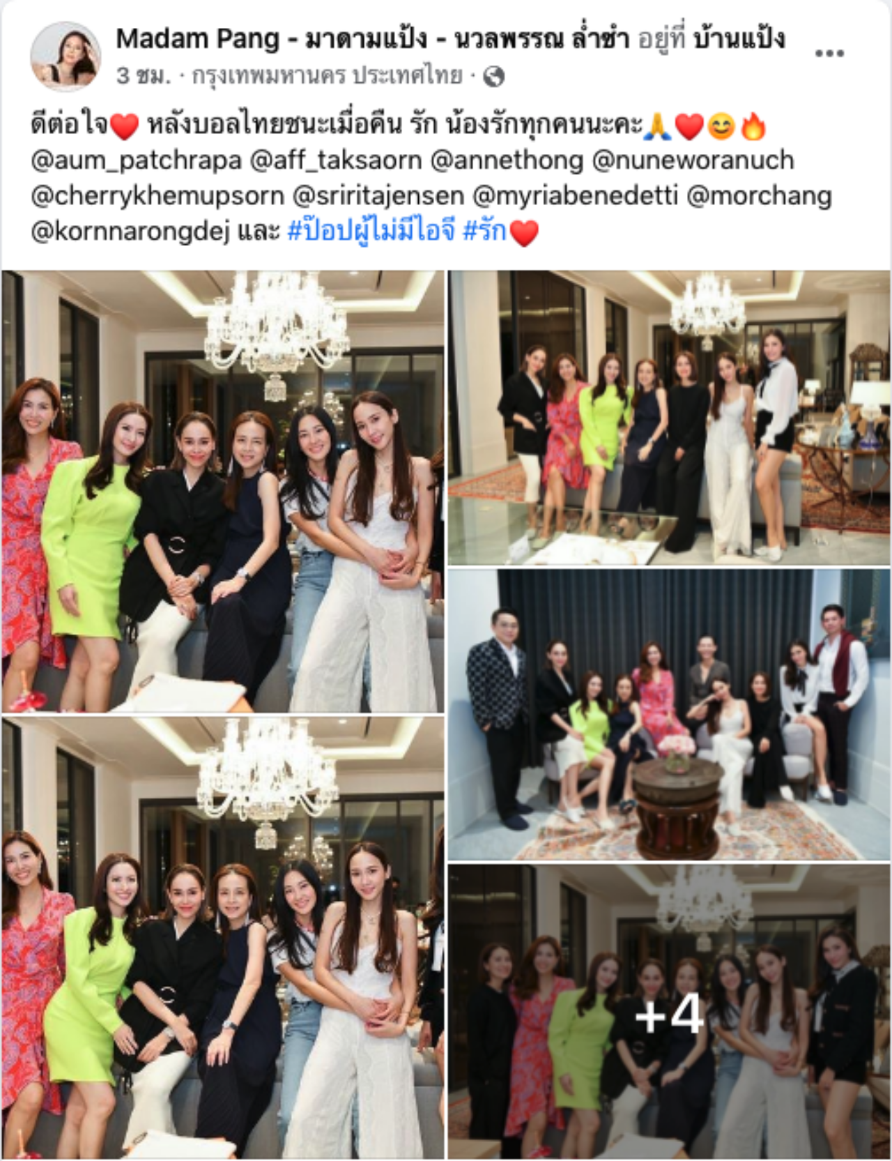 ซึ่ง มาดามแป้ง ก็ได้โพสต์ภาพผ่านโซเชียลของตัวเอง พร้อมกับเขียนแคปชั่นว่า "ดีต่อใจ หลังบอลไทยชนะเมื่อคืน รัก น้องรักทุกคนนะคะ @aum_patchrapa @aff_taksaorn @annethong @nuneworanuch @cherrykhemupsorn @sriritajensen @myriabenedetti @morchang @kornnarongdej และ #ป๊อปผู้ไม่มีไอจี #รัก"
