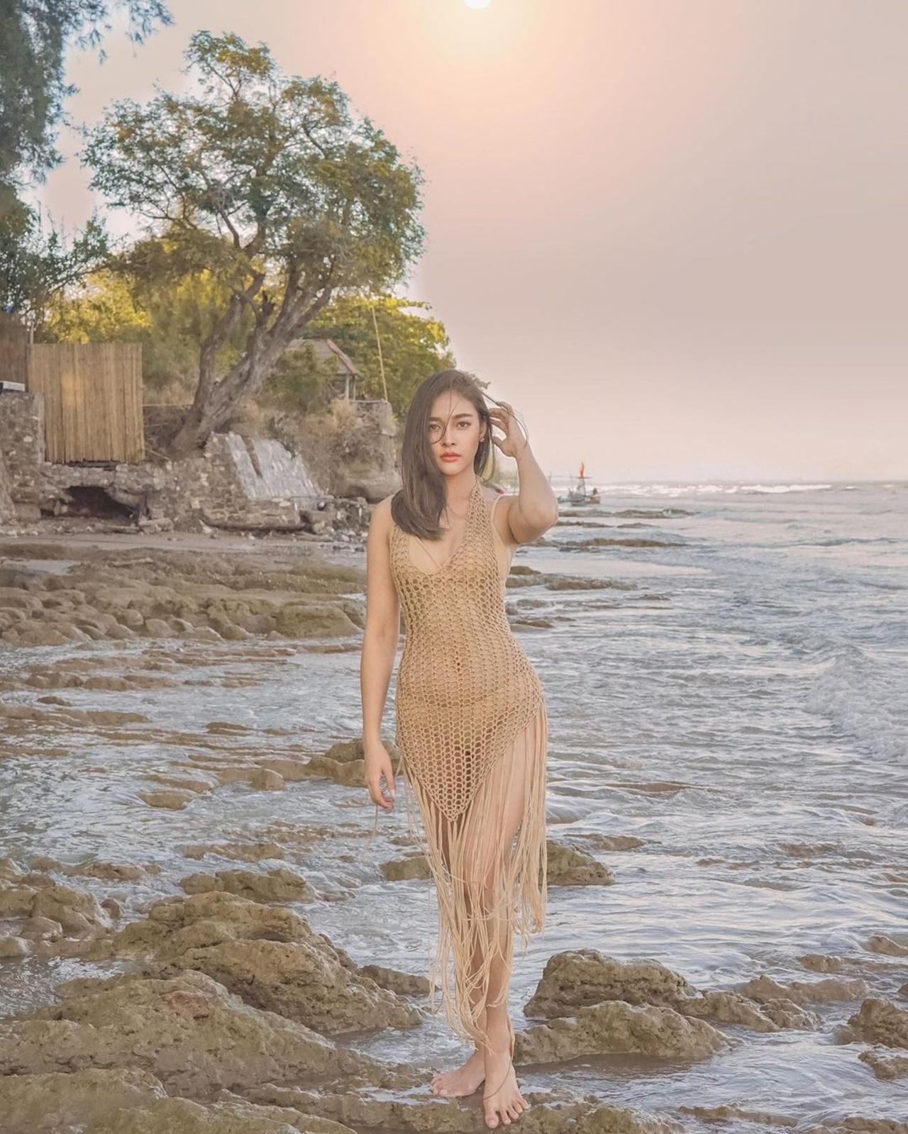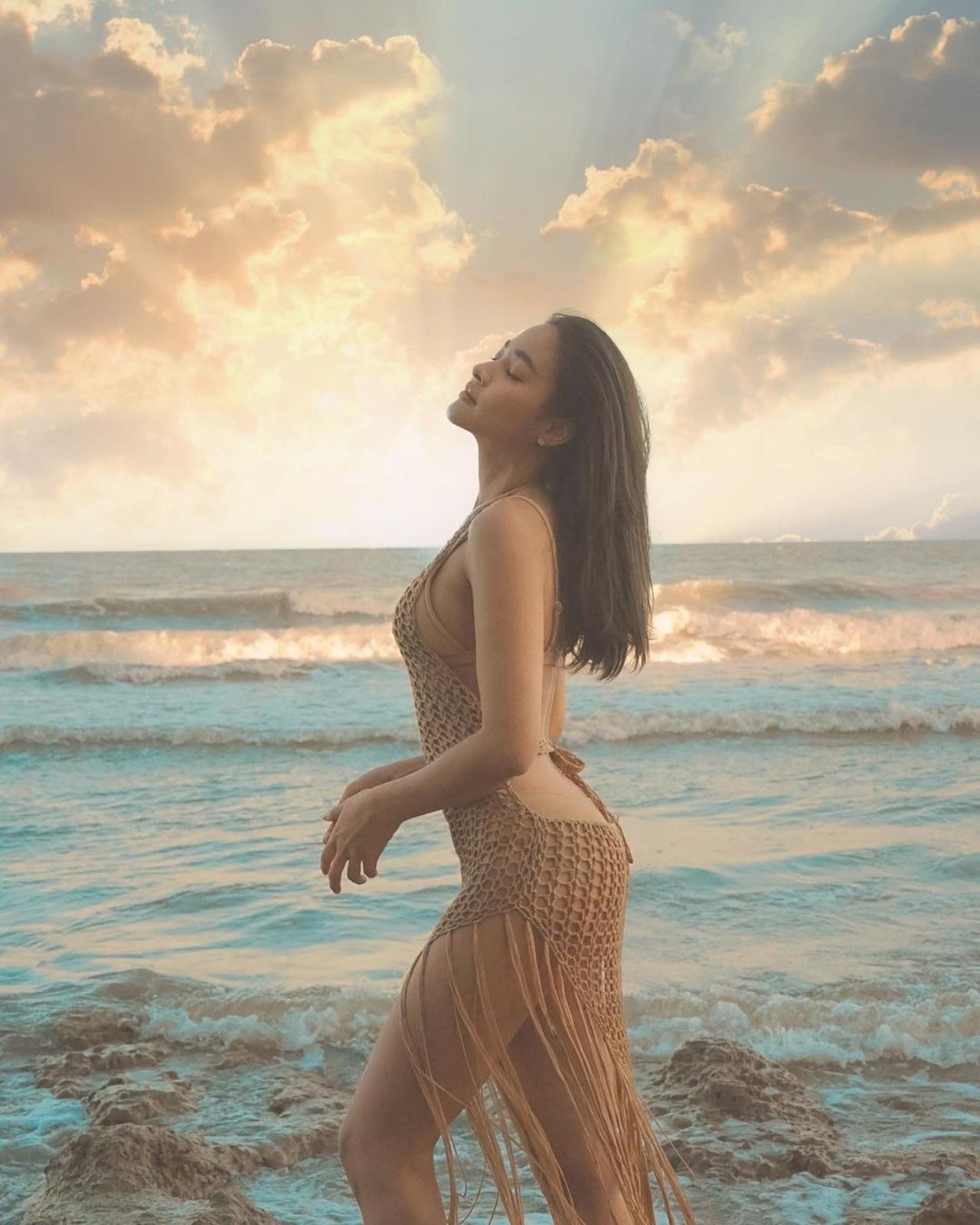 งานนี้นางเอกสาวคนสวยเลยหยิบบิกินีสีเนื้อพร้อมด้วยชุดตาข่ายถักสีเดียวกันมาใส่ถ่ายรูปอวดความเซ็กซี่ให้แฟนๆ ได้ชมกัน
