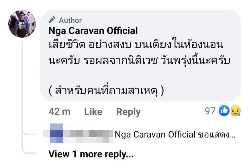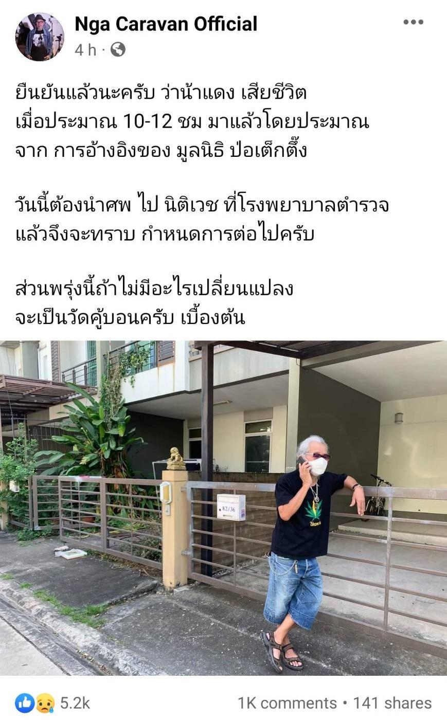 โดยแอดมินเพจดังกล่าวโพสต์ถึงเรื่องดังกล่าวไว้ว่า “ยืนยันแล้วนะครับ ว่าน้าแดง เสียชีวิต เมื่อประมาณ 10-12 ชม. มาแล้วโดยประมาณ จากการอ้างอิงของมูลนิธิป่อเต็กตึ๊ง วันนี้ต้องนำศพ ไปนิติเวช ที่โรงพยาบาลตำรวจ แล้วจึงจะทราบกำหนดการต่อไปครับ ส่วนพรุ่งนี้ถ้าไม่มีอะไรเปลี่ยนแปลง จะเป็นวัดคู้บอนครับ เบื้องต้น”
