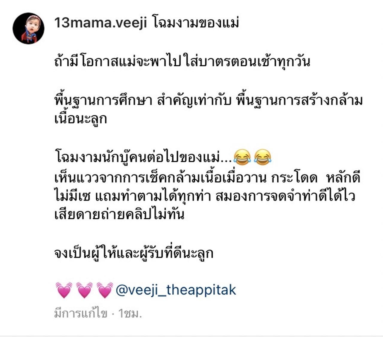 "โฉมงามของแม่ ถ้ามีโอกาสแม่จะพาไปใส่บาตรตอนเช้าทุกวัน พื้นฐานการศึกษา สำคัญเท่ากับ พื้นฐานการสร้างกล้ามเนื้อนะลูก โฉมงามนักบู๊คนต่อไปของแม่... เห็นแววจากการเช็คกล้ามเนื้อเมื่อวาน กระโดด หลักดีไม่มีเซ แถมทำตามได้ทุกท่า สมองการจดจำท่าดีได้ไว เสียดายถ่ายคลิปไม่ทัน จงเป็นผู้ให้และผู้รับที่ดีนะลูก @veeji_theappitak"