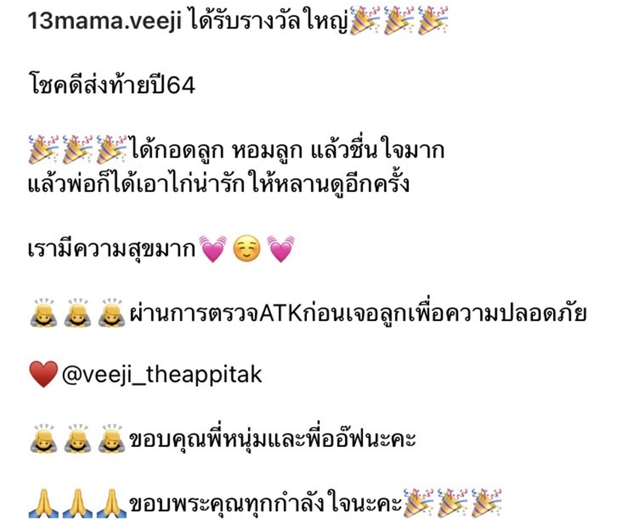 "ได้รับรางวัลใหญ่ โชคดีส่งท้ายปี64 ได้กอดลูก หอมลูก แล้วชื่นใจมาก แล้วพ่อก็ได้เอาไก่น่ารักให้หลานดูอีกครั้ง เรามีความสุขมาก ผ่านการตรวจATKก่อนเจอลูกเพื่อความปลอดภัย @veeji_theappitak ขอบคุณพี่หนุ่มและพี่อ๊อฟนะคะ ขอบพระคุณทุกกำลังใจนะคะ"