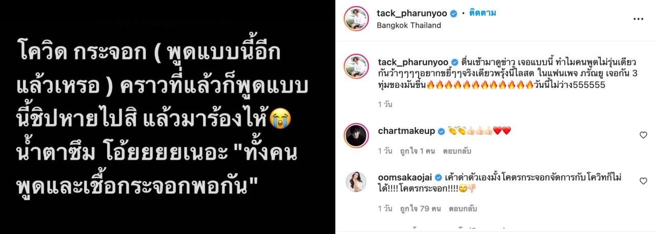 แทค ภรัณยู โพสต์ไอจีตรงๆ ดังนี้ “โควิด กระจอก (พูดแบบนี้อีกแล้วเหรอ) คราวที่แล้วก็พูดแบบนี้ชิ-หายไปสิ แล้วมาร้องไห้ น้ำตาซึม โอ๊ยยยยเนอะ ทั้งคนพูดและเชื้อกระจอกพอกัน”