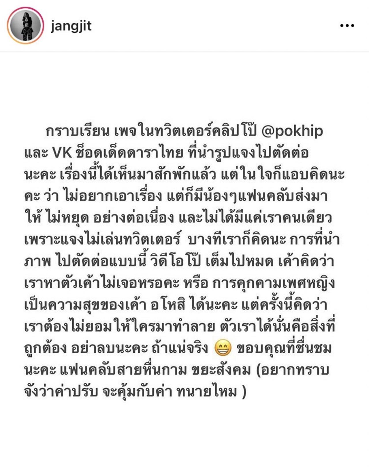 "กราบเรียน เพจในทวิตเตอร์คลิปโป๊ @pokhip และ VK ช็อดเด็ดดาราไทย ที่นำรูปแจงไปตัดต่อนะคะ เรื่องนี้ได้เห็นมาสักพักแล้ว แต่ในใจก็แอบคิดนะคะ ว่า ไม่อยากเอาเรื่อง แต่ก็มีน้องๆ แฟนคลับส่งมาให้ไม่หยุดอย่างต่อเนื่อง