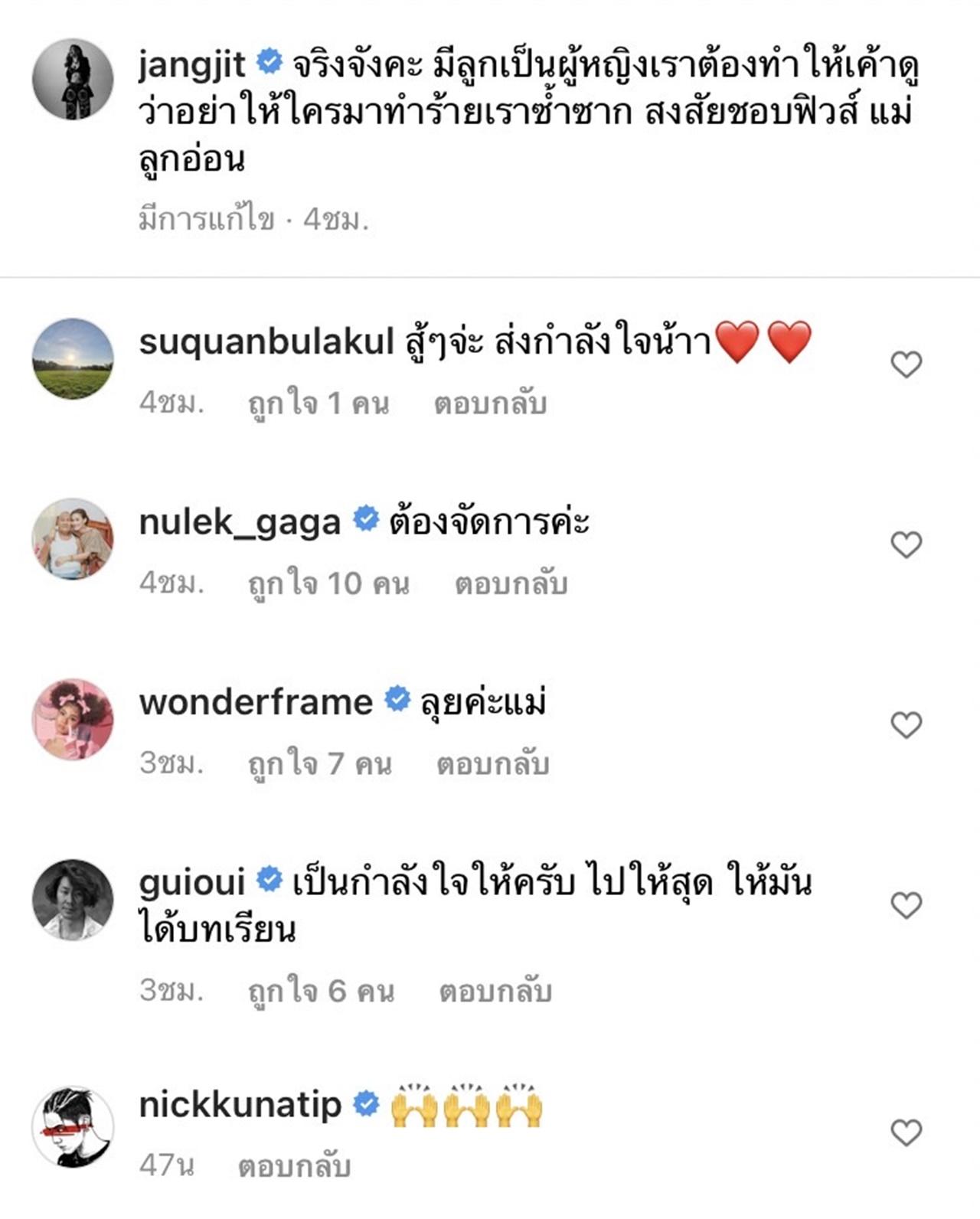 จากนั้นก็ได้เขียนแคปชั่นว่า "จริงจังค่ะ มีลูกเป็นผู้หญิงเราต้องทำให้เค้าดูว่าอย่าให้ใครมาทำร้ายเราซ้ำซาก สงสัยชอบฟีลแม่ลูกอ่อน" หลายคนที่ติดตามรวมไปถึงคนในวงการบันเทิง ก็ได้เข้ามาแสดงความคิดเห็นกันเป็นจำนวนมาก พร้อมบอกให้เอาเรื่องให้ถึงที่สุด เพื่อจะได้เป็นบทเรียนกับคนที่คิดจะทำแบบนี้กับคนอื่น.