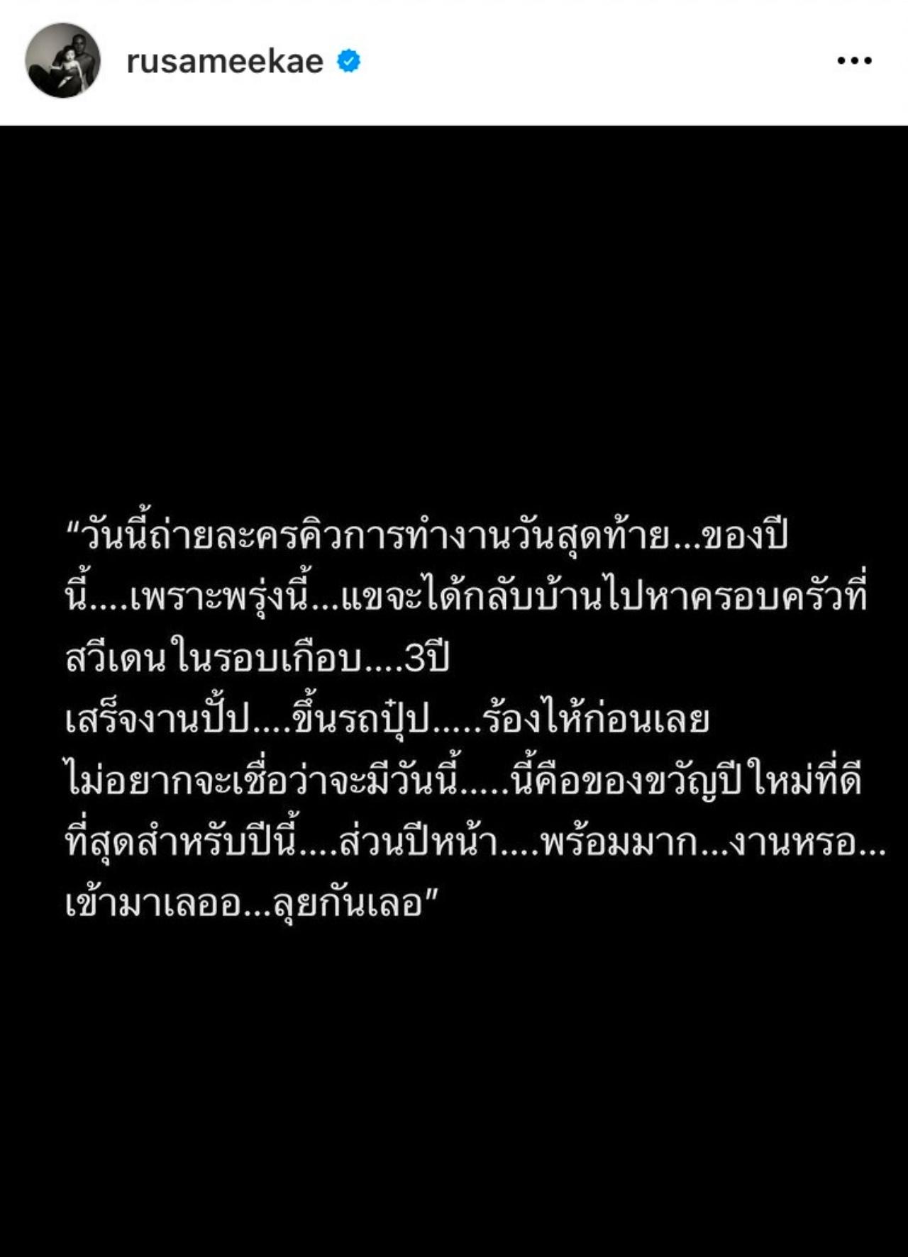 "วันนี้ถ่ายละครคิวการทำงานวันสุดท้ายของปีนี้ เพราะพรุ่งนี้แขจะได้กลับบ้านไปหาครอบครัวที่สวีเดนในรอบเกือบ 3 ปี เสร็จงานปั๊บ ขึ้นรถปุ๊บ ร้องไห้ก่อนเลย ไม่อยากจะเชื่อว่าจะมีวันนี้ นี่คือของขวัญปีใหม่ที่ดีที่สุดสำหรับปีนี้ ส่วนปีหน้าพร้อมมาก งานหรอ เข้ามาเลย ลุยกันเลย" และเขียนแคปชั่นต่อว่า "กลับไปเติมพลัง แล้วจะเอาพลังงานดีๆ ใหม่ มาส่งต่อให้กับทุกคนในปีหน้านะครับ #วิถีคิงคอง"