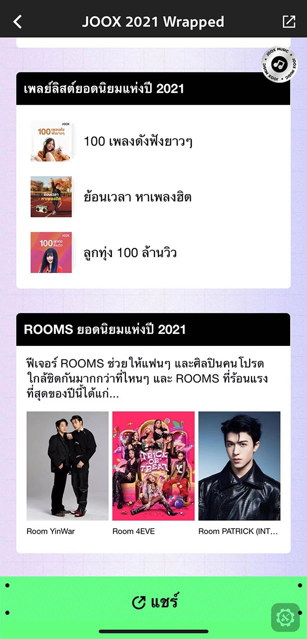 เมื่อโค้งสุดท้ายของปี 2021 กำลังจะมาถึง JOOX จึงขอโชว์สถิติที่น่าสนใจบนแพลตฟอร์ม กับ Music Annual Review 2021 ที่ดึงบิ๊กดาต้าพฤติกรรมผู้ใช้งานชาวไทย ทั้งการฟังเพลง การจอยและสร้างห้องต่างๆ ผ่านฟีเจอร์ JOOX ROOMS ชมไลฟ์อีเวนต์ต่างๆ รวมไปถึงเทรนด์และกระแสความฮิตเกี่ยวกับดนตรีของผู้ใช้งาน ไม่ว่าจะเป็นศิลปิน หรือเพลงที่ได้รับความนิยมสูงสุด หรือกระแสความฮิตของฟีเจอร์ใหม่อย่าง JOOX ROOMS พร้อมส่ง JOOX Wrapped 2021 ให้ผู้ใช้งานได้สนุกกับการดูสถิติการฟังเพลงของตัวเอง