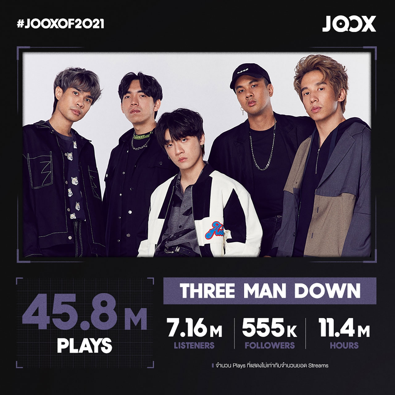 จากพฤติกรรมการฟังเพลงของผู้ใช้งานชาวไทย พบว่าศิลปินที่ครองใจแฟนเพลงชาวไทยมากที่สุดแห่งปี 2021 ยังคงเป็น THREE MAN DOWN เจ้าของเพลงฮิตมากมาย อย่าง วันเกิดฉันปีนี้, ฝนตกไหม และฝันถึงแฟนเก่า ด้วยการยืนหนึ่งศิลปินที่มีสถิติการฟังเพลงมากที่สุดเป็นปีที่ 2 โดยตลอดปีนี้มียอดการฟังเพลงสูงกว่าถึง 45.8 ล้านครั้ง ซึ่งเพลง ‘ถ้าเธอรักฉันจริง’ เป็นซิงเกิลที่คว้าอันดับ 5 เพลงฮิตแห่งปีไปครองอีกด้วย