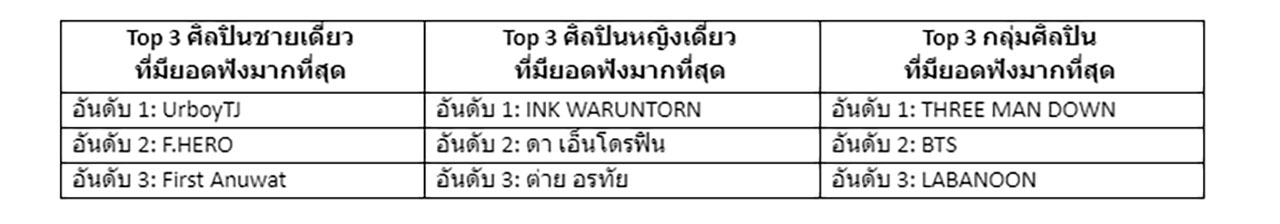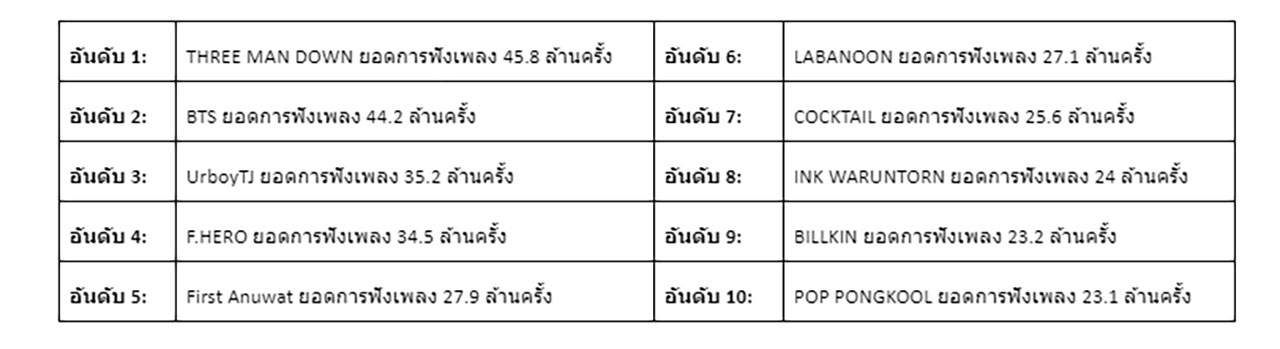 ⦁ ร้อนแรงไม่มีตก สำหรับ THREE MAN DOWN ที่ส่งเพลงฮิตเข้าท็อปชาร์ตตลอดปี ทำให้ปีนี้ยังคงครองอันดับ 1 ศิลปินที่คนไทยฟังเพลงมากที่สุดเป็นปีที่ 2 ด้วยยอดการฟังเพลงกว่า 45.8 ล้านครั้ง (Playtime) ในประเทศไทย ทุบสถิติปีก่อนกันไปเลย (41.5 ล้านครั้ง)