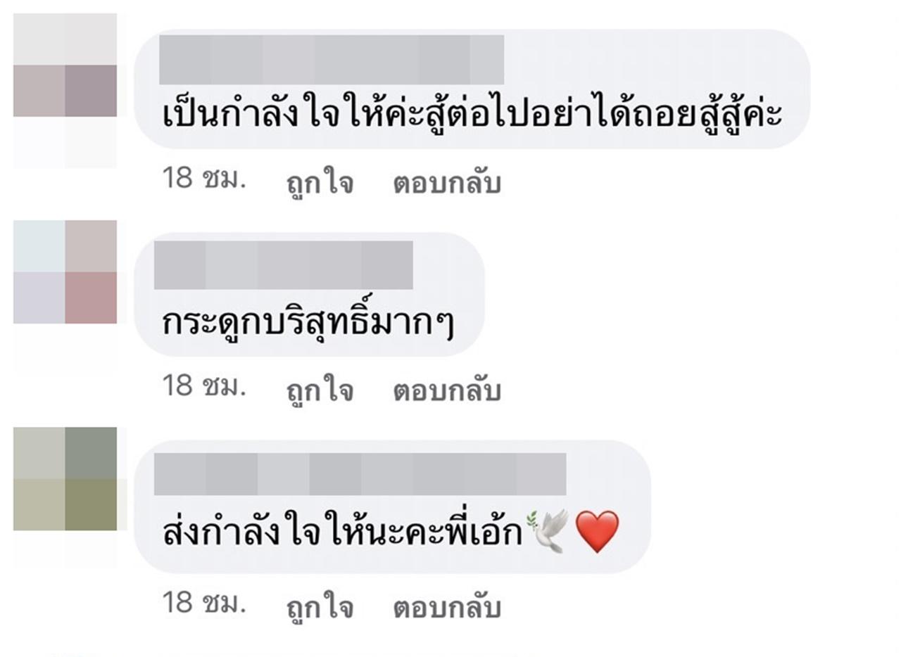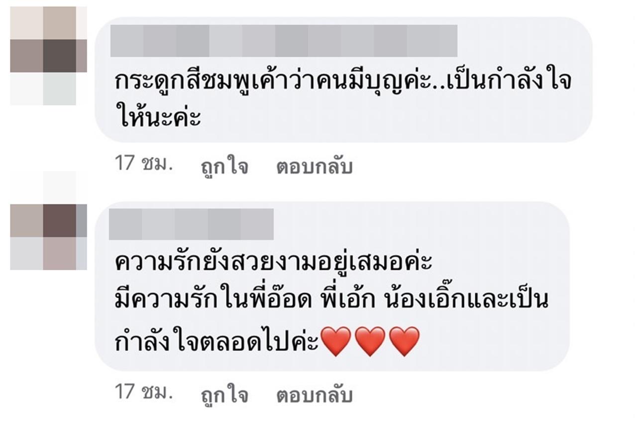 ซึ่งหลังจากที่ภรรยาของ อ๊อด คีรีบูน ได้โพสต์รูปและข้อความดังกล่าวไป ก็มีเพื่อนพี่น้องในวงการบันเทิงและแฟนคลับร่วมแสดงความเสียใจจำนวนมากว่า "เป็นกำลังใจให้นะคะ, กระดูบริสุทธิ์มากๆ, พี่อ๊อดเป็นคนมีบุญมากกระดูกจึงเป็นสีชมพู เป็นกำลังใจให้พี่เอ้กกับน้องเอิ้ก สู้ๆ,