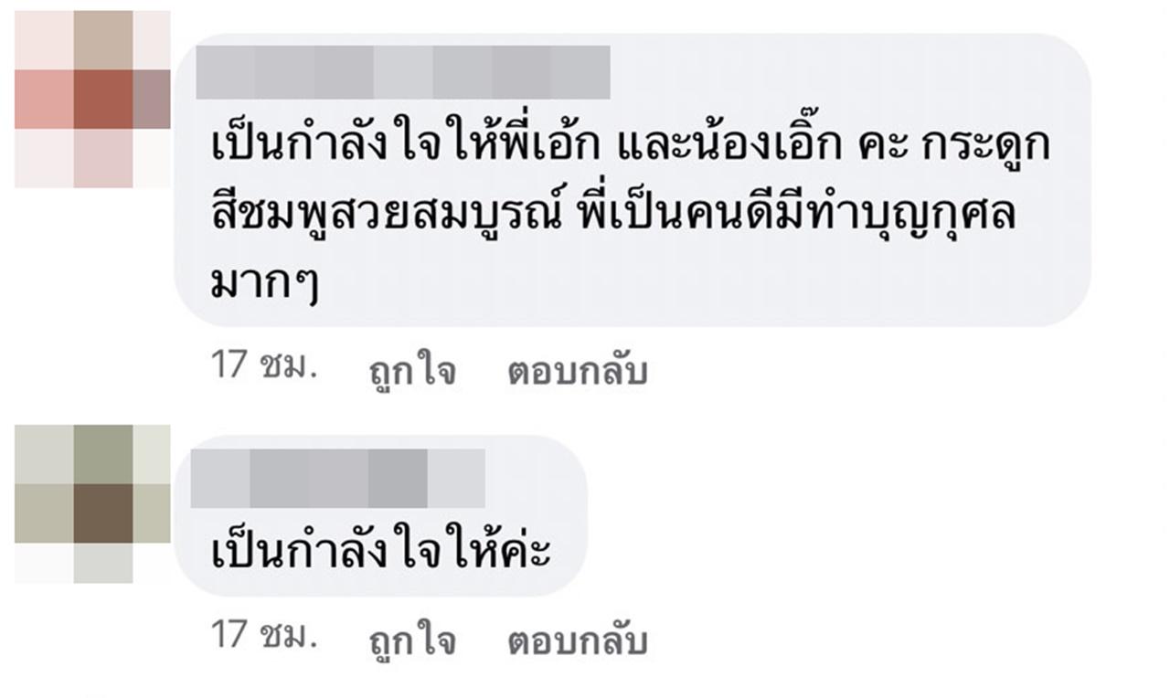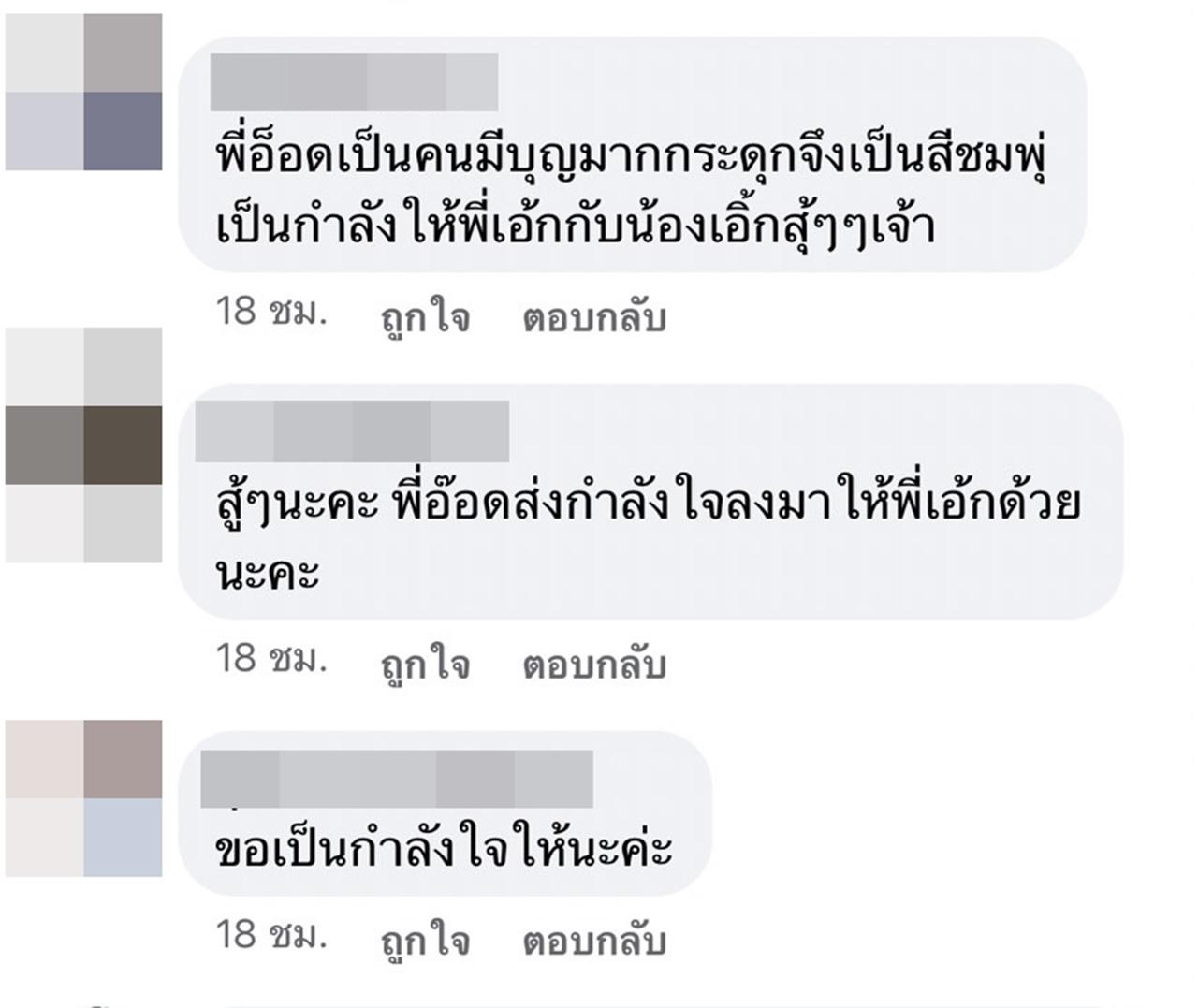 กระดูกสีชมพูเค้าว่าคนมีบุญค่ะ เป็นกำลังใจให้นะคะ, เป็นกำลังใจให้พี่เอ้กและน้องเอิ้กค่ะ กระดูกสีชมพูสวยสมบูรณ์ พี่เป็นคนดีมีบุญกุศลมากๆ, กระดูกใสสะอาดเหมือนกับจิตใจพี่อ๊อดเลยครับ ยิ่งถ้าบอกว่าป่วยด้วยโรคมะเร็ง กระดูกไม่น่าใสสะอาดขนาดนี้ได้เลย พี่อ๊อดเป็นผู้มีบุญและธรรมะนำทางครับ".