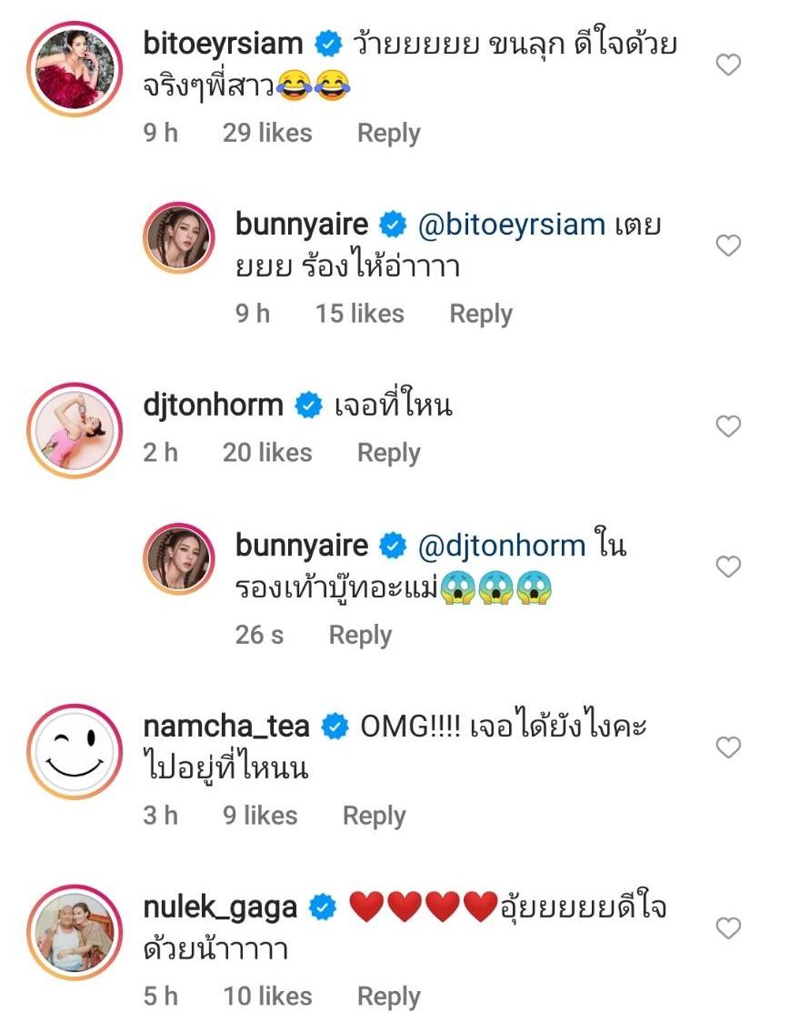 โดยมีแฟนๆ เข้ามาคอมเมนต์ดีใจด้วยที่หาเพชรเจอแล้ว รวมไปถึงคนในวงการบันเทิงที่แสดงความคิดเห็น อาทิ ใบเตย อาร์สยาม “ว้ายยยยย ขนลุก ดีใจด้วยจริงๆพี่สาว”, ดีเจต้นหอม “เจอที่ใหน”, น้ำชา ชีรณัฐ “OMG!!!! เจอได้ยังไงคะ ไปอยู่ที่ไหนน”, อุ้ม ลักขณา “เย้ ดีใจด้วยนะคะ”, หนูเล็ก ก่อนบ่าย “อุ้ยยยยยดีใจด้วยน้าาาาา”, เปิ้ล ภารดี “ดีใจด้วยน้า” ฯลฯ.