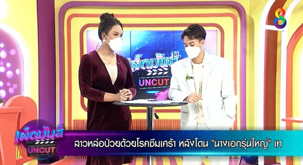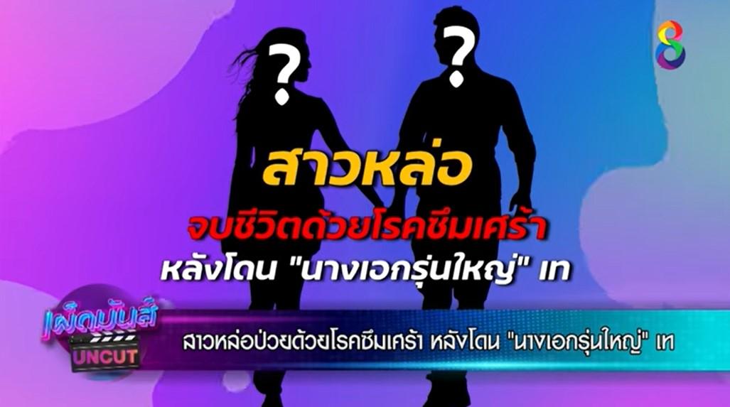 รายการ "เผ็ดมันส์บันเทิง อันคัต" ช่อง 8 เผยข่าวลือมีสาวหล่อป่วยด้วยโรคซึมเศร้า ตัดสินใจจบชีวิตหลังโดนนางเอกรุ่นใหญ่เท เรื่องเกิดขึ้นได้ประมาณเดือนกว่าๆ แล้ว โดยทางบ้านสาวหล่อคนนี้ทราบเรื่องความสัมพันธ์ของทั้งคู่ แต่ด้วยสาวทอมเคยป่วยอาการซึมเศร้ามาก่อน หลังมาคบนางเอกรุ่นใหญ่ก็ทุ่มเทใจอย่างมาก และทำให้มีอาการป่วยดีขึ้น แต่ไม่นานก็มีเรื่องราวระหองระแหงเป็นระยะๆ และโดนขอเลิก จึงตัดสินใจจบชีวิตตัวเองเพราะอาการซึมเศร้า
