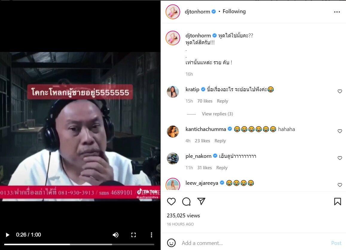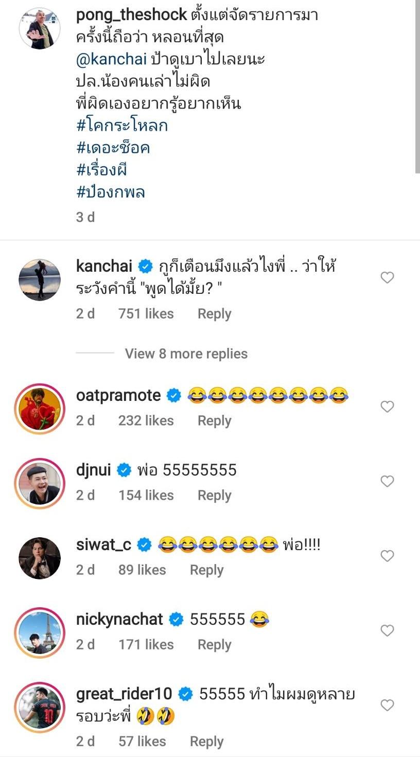 ซึ่งนอกจากจะมีคนในวงการบันเทิงรวมถึงแฟนๆ เข้ามาคอมเมนต์ขำหนักมากแล้ว ด้านหนุ่ม กรรชัย ก็เข้ามาแสดงความคิดเห็นว่า “-ูก็เตือนมึ-แล้วไงพี่ .. ว่าให้ระวังคำนี้ "พูดได้มั้ย?"” ทำเอาชาวเน็ตแห่กดไลค์และแซวต่อแบบรัวๆ ด้านดีเจต้นหอม ศกุนตลา ก็เอาคลิปดังกล่าวไปโพสต์ในไอจีตัวเองด้วย