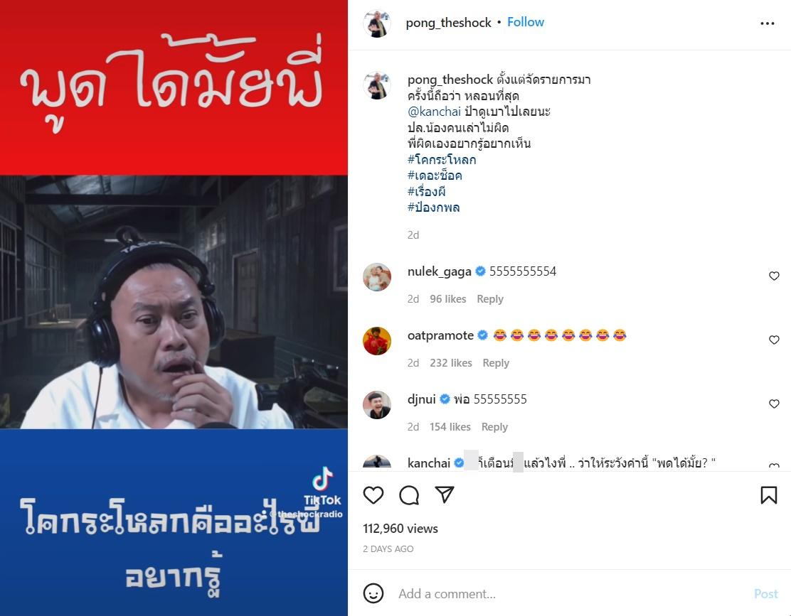 ซึ่งป๋องก็ได้นำคลิปดังกล่าวมาโพสต์ลงในไอจีส่วนตัว พร้อมทั้งเขียนแคปชั่น “ตั้งแต่จัดรายการมา ครั้งนี้ถือว่า หลอนที่สุด @kanchai ป้าดูเบาไปเลยนะ ปล.น้องคนเล่าไม่ผิด พี่ผิดเองอยากรู้อยากเห็น #โคกระโหลก #เดอะช็อค #เรื่องผี #ป๋องกพล”