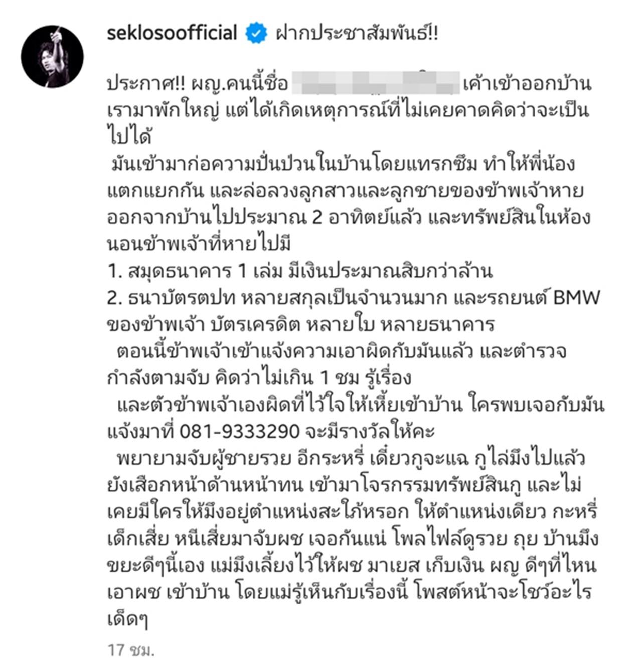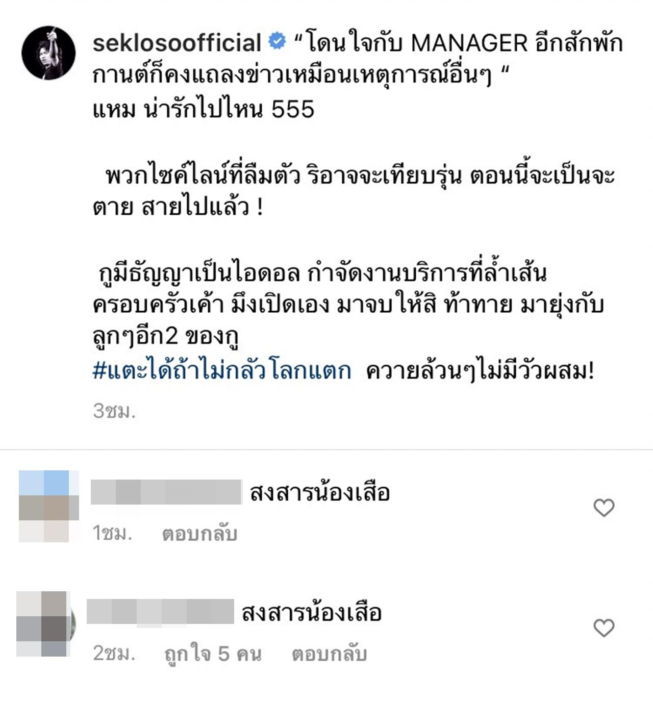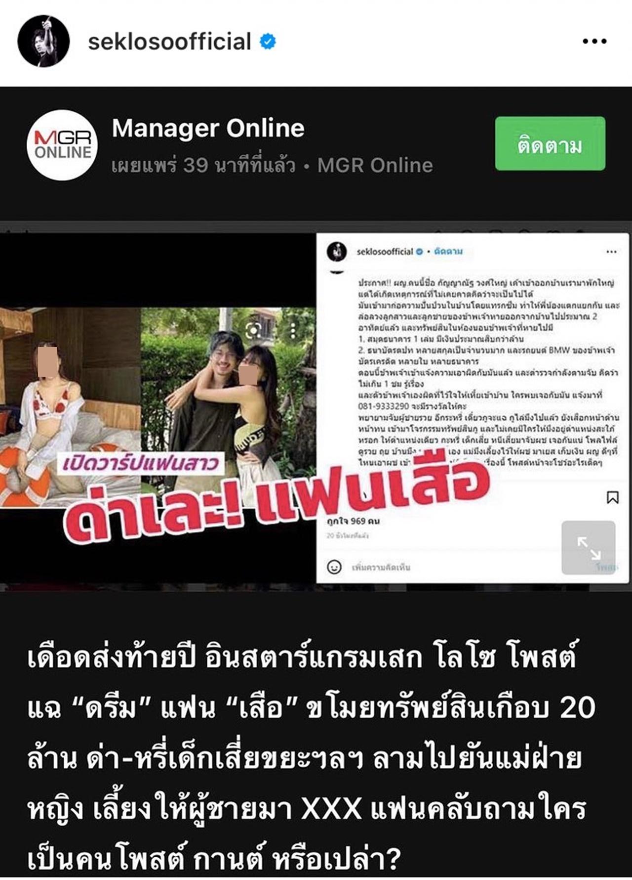 เรียกว่าเป็นประเด็นร้อนที่ทำเอาหลายคนสงสัยว่าเกิดอะไรขึ้น เมื่อในอินสตาแกรมของ เสก โลโซ เสกสรรค์ ศุขพิมาย ศิลปินร็อกชื่อดัง ได้โพสต์ภาพข่าวของลูกชาย เสือ เสฏกานต์ ที่เปิดตัวแฟนสาว พร้อมฉะแหลกฝ่ายหญิงว่า ขโมยเงิน 20 ล้าน และเข้ามาทำให้ความสัมพันธ์ระหว่างพี่น้องต้องแตกกัน