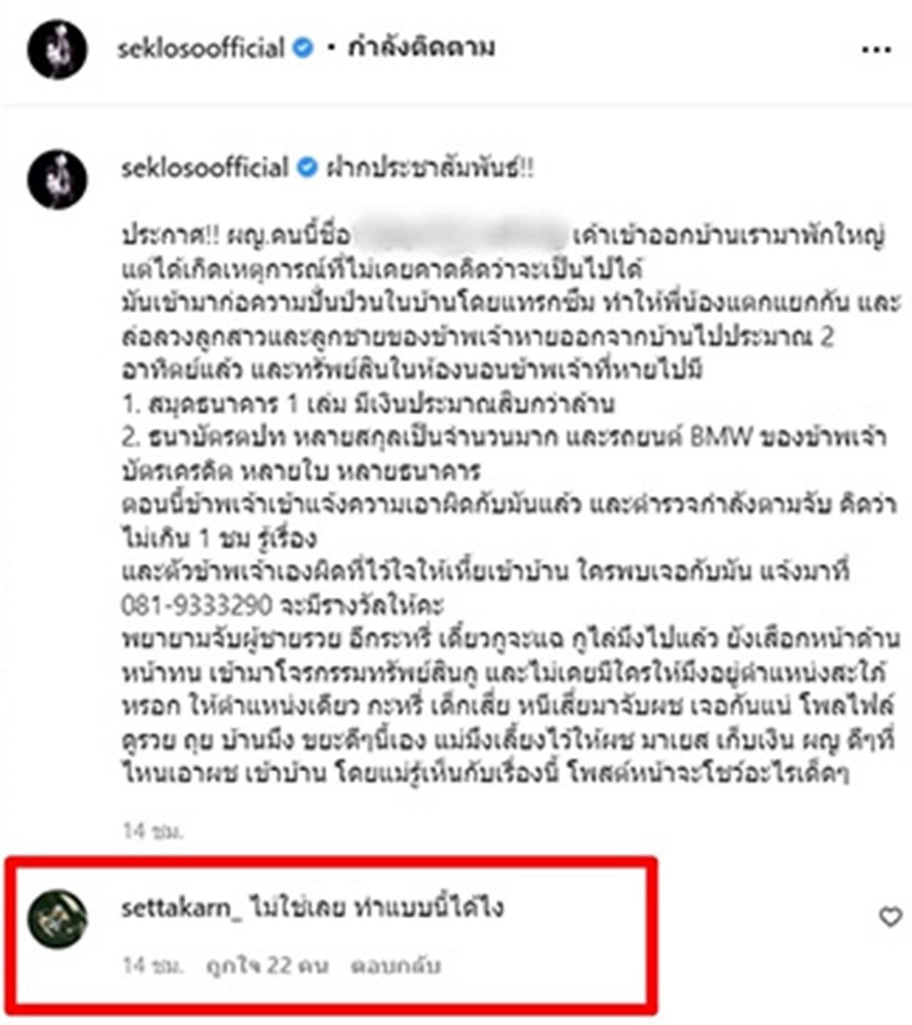 ตอนนี้ข้าพเจ้าเข้าแจ้งความเอาผิดกับมันแล้ว และตำรวจกำลังตามจับ คิดว่าไม่เกิน 1 ชั่วโมง รู้เรื่อง และตัวข้าพเจ้าเองผิดที่ไว้ใจให้เหี้_เข้าบ้าน ใครพบเจอกับมัน แจ้งมาที่ (แจ้งเบอร์) จะมีรางวัลให้ค่ะ