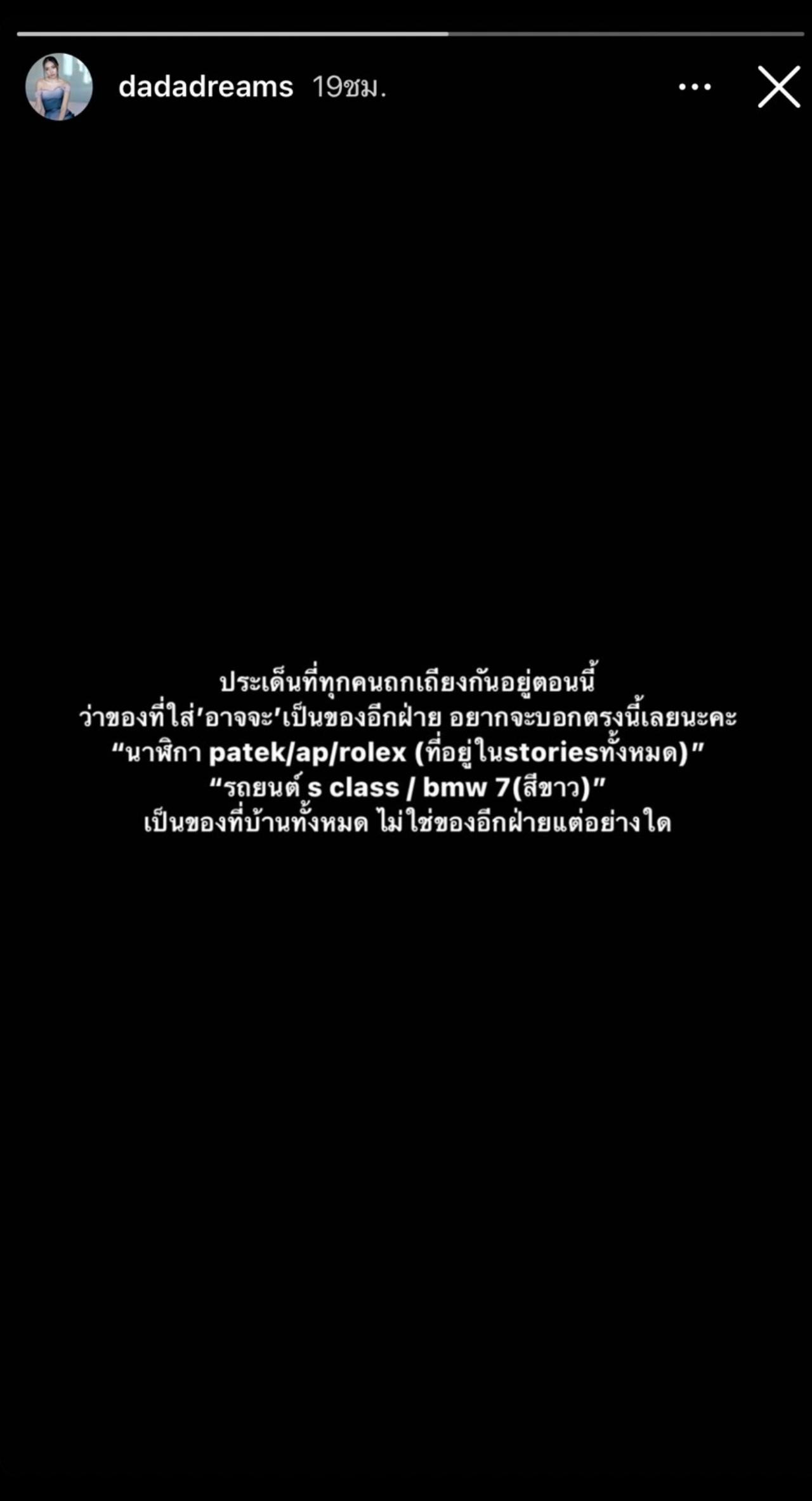 และล่าสุด ดรีม ได้โพสต์ไอจีสตอรี่อีกครั้ง ด้วยข้อความว่า “ประเด็นที่ทุกคนถกเถียงกันอยู่ตอนนี้ ว่าของที่ใส่ ‘อาจจะ’ เป็นของอีกฝ่าย อยากจะบอกตรงนี้เลยนะคะ “นาฬิกา patek/ap/rolex (ที่อยู่ในstoriesทั้งหมด) รถยนต์ s class / bmw 7 (สีขาว)” เป็นของที่บ้านทั้งหมด ไม่ใช่ของอีกฝ่ายแต่อย่างใด”