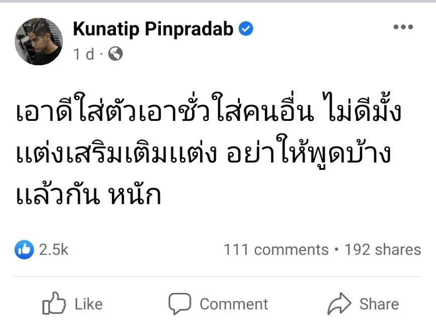 ซึ่งหลังจากนั้นนักแสดงหนุ่ม นิก คุณาธิป ปิ่นประดับ ก็ได้โพสต์ข้อความเดือดลงในเฟซบุ๊กส่วนตัวว่า “เอาดีใส่ตัวเอาชั่วใส่คนอื่น ไม่ดีมั้ง แต่งเสริมเติมแต่ง อย่าให้พูดบ้างแล้วกัน หนัก”